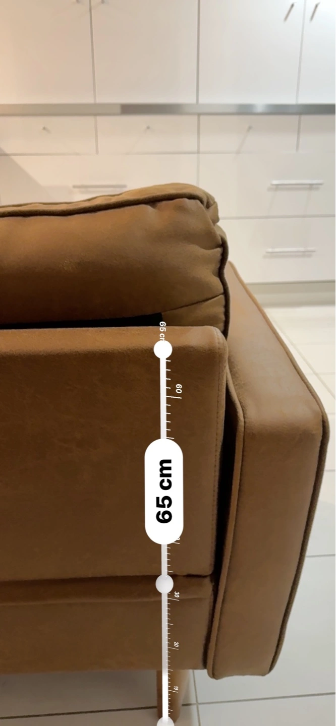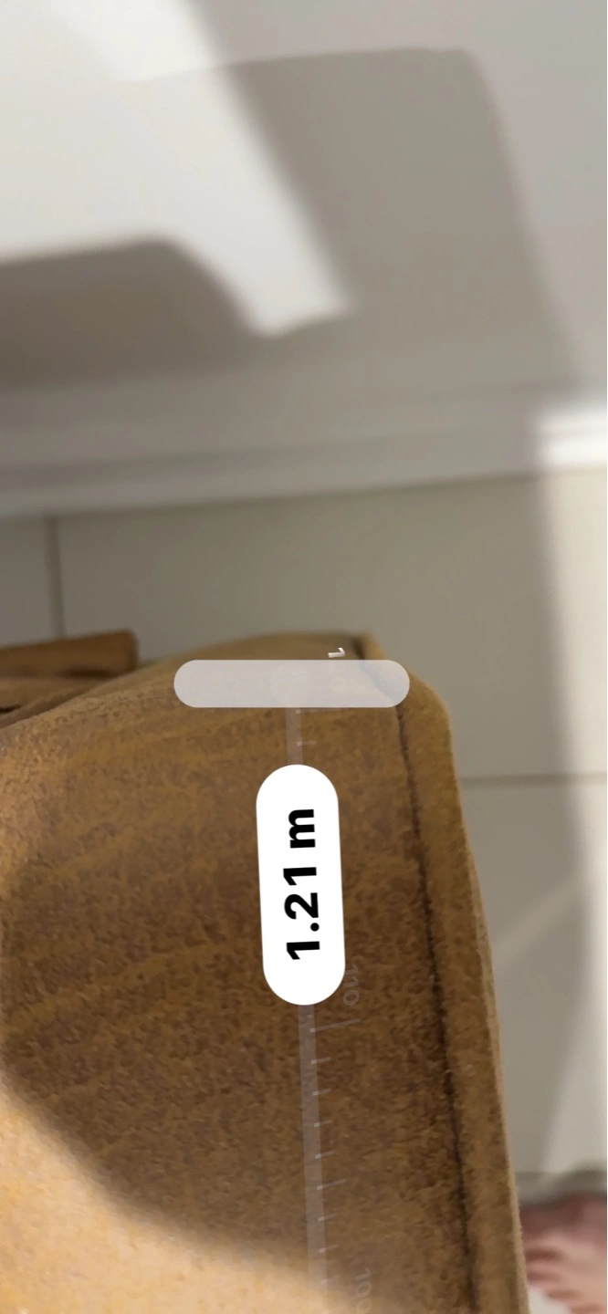 Approximately 2.1 m long and 1.21 m wide. Armrest height is 65 cm.