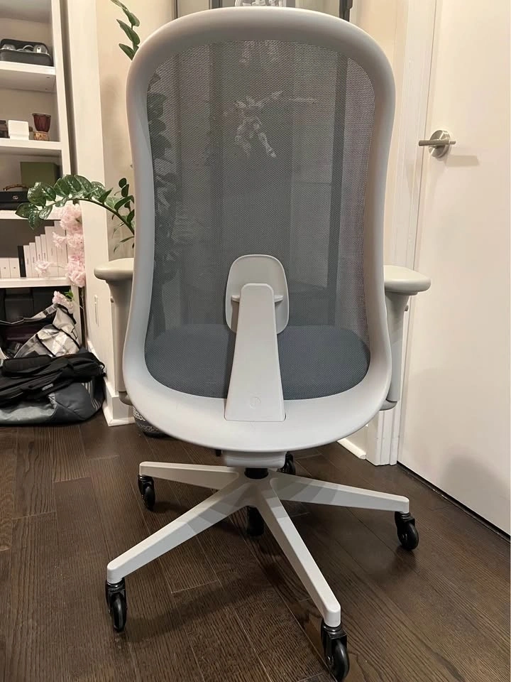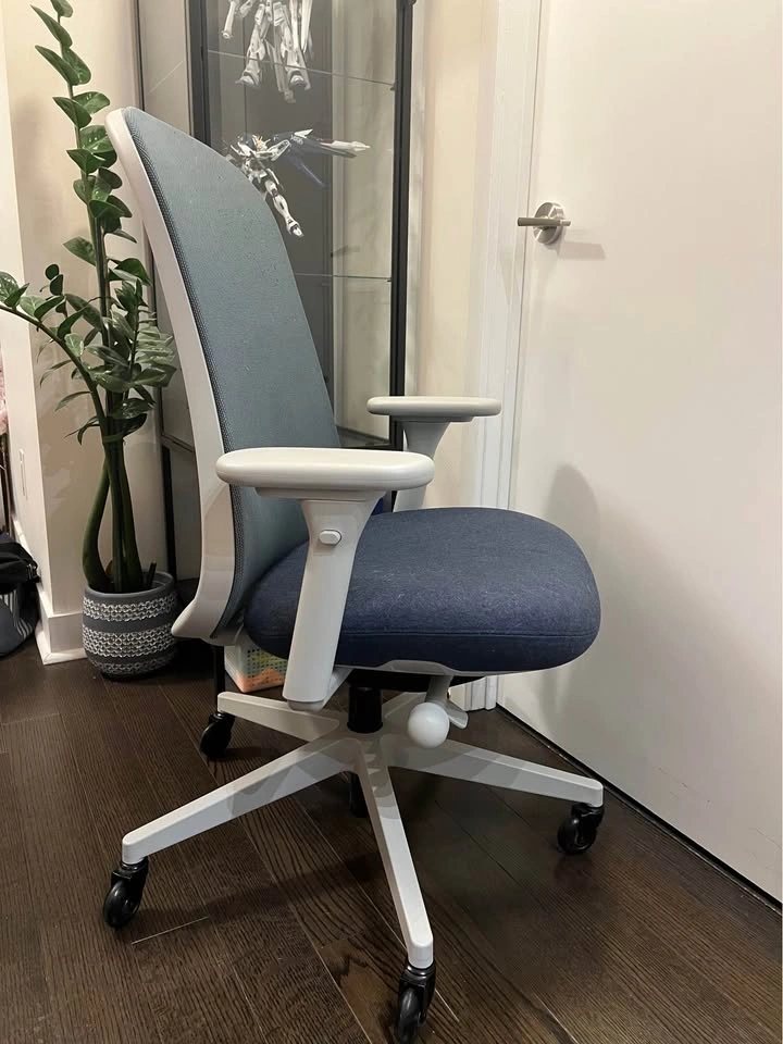 Features adjustable lumbar support, height adjustable arms, and fixed seat depth.