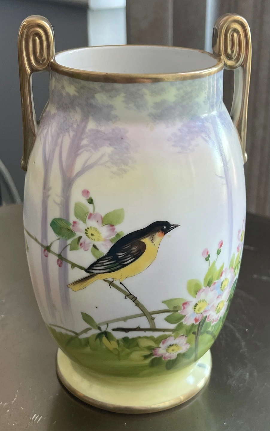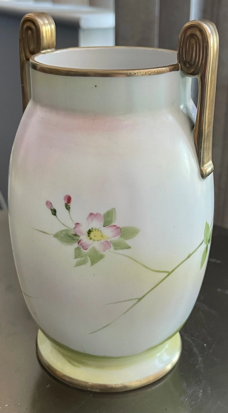 Offering a stunning, authentic antique Nippon porcelain vase. This piece features a delicately hand-painted bird and floral scene, accented with gold detailing on the handles and rim.