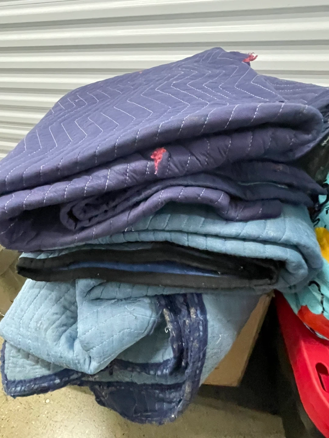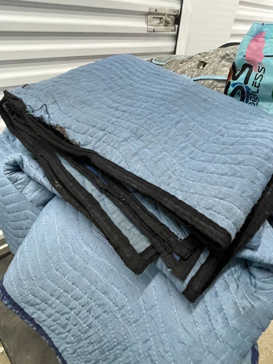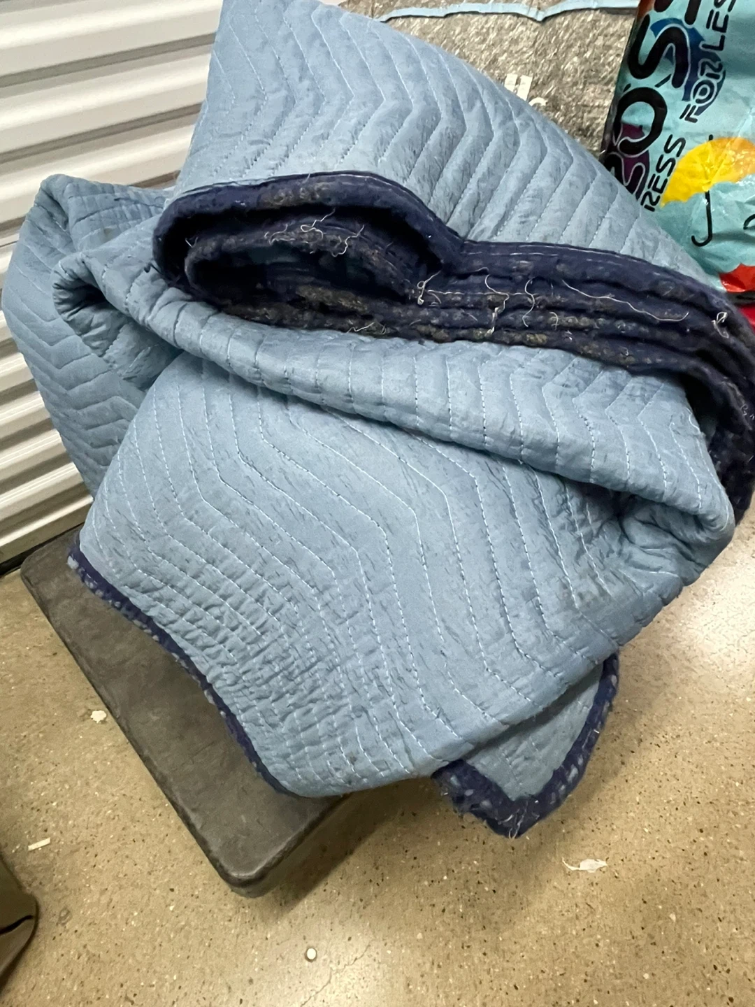 Quilted moving blankets, blue and navy colors. Protect your furniture and belongings during transport. Durable stitching and padding.
