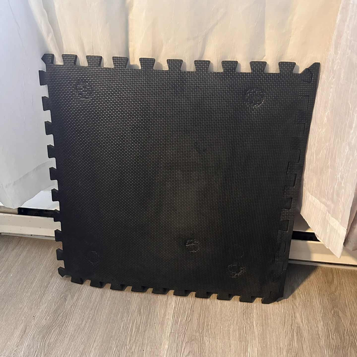 Two interlocking foam floor mats. Black colour. They connect easily to create a larger cushioned surface. Foam material.