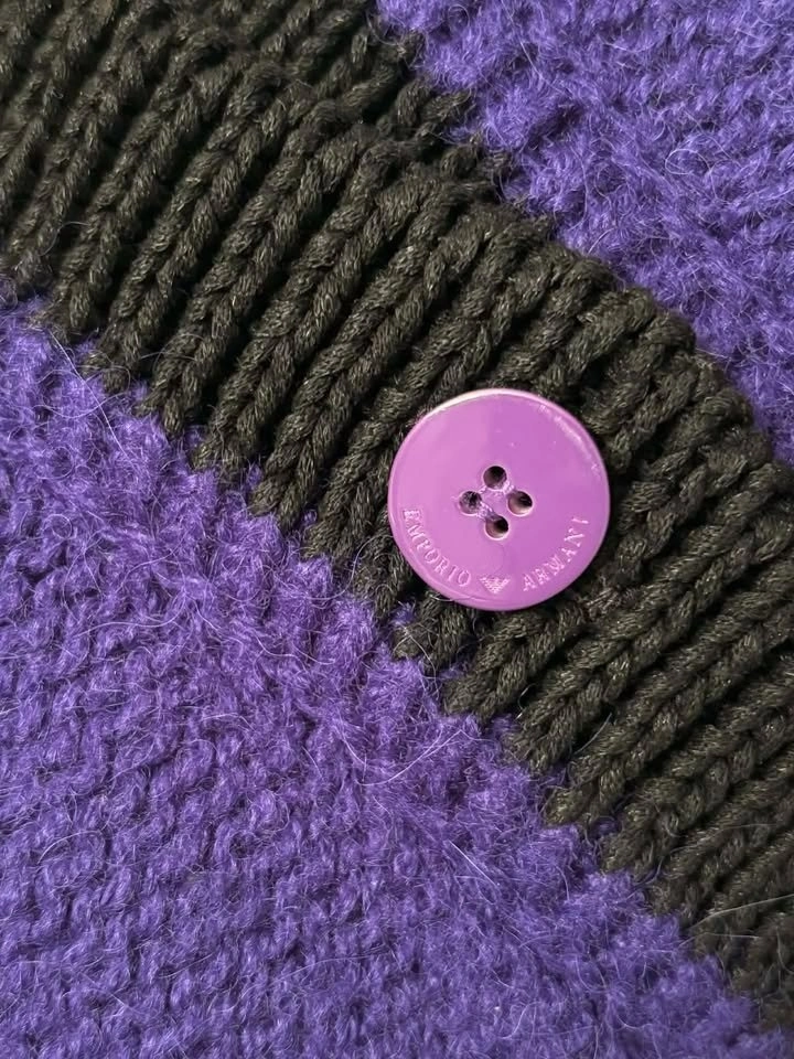 This piece dates to the late 1990s–early 2000s, a standout era of Armani design known for sculptural silhouettes and elevated knitwear. Genuine Emporio Armani woven label with eagle logo. Size 36 (women’s XS / slim S – true vintage fit). Longline, tailored silhouette. Custom Armani-engraved purple buttons. Decorative corset-style lacing at the shoulders. Multi-texture knit panels with contrast ribbed trim. High-quality, substantial knit construction. This is a rare, collectible Armani piece, perfect for vintage designer collectors, Y2K styling, or anyone looking for a timeless statement cardigan.