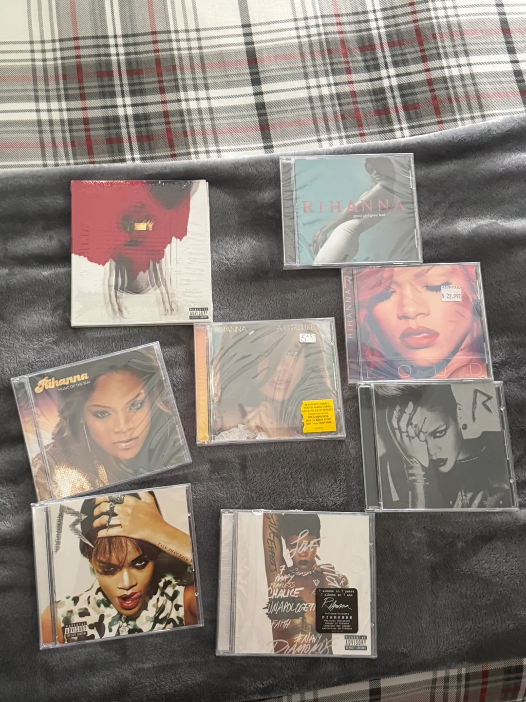 Includes albums like 'Music of the Sun', 'Good Girl Gone Bad', 'Talk That Talk', and 'Unapologetic'. All CDs appear to be in original plastic wrap. Great for any Rihanna fan!
