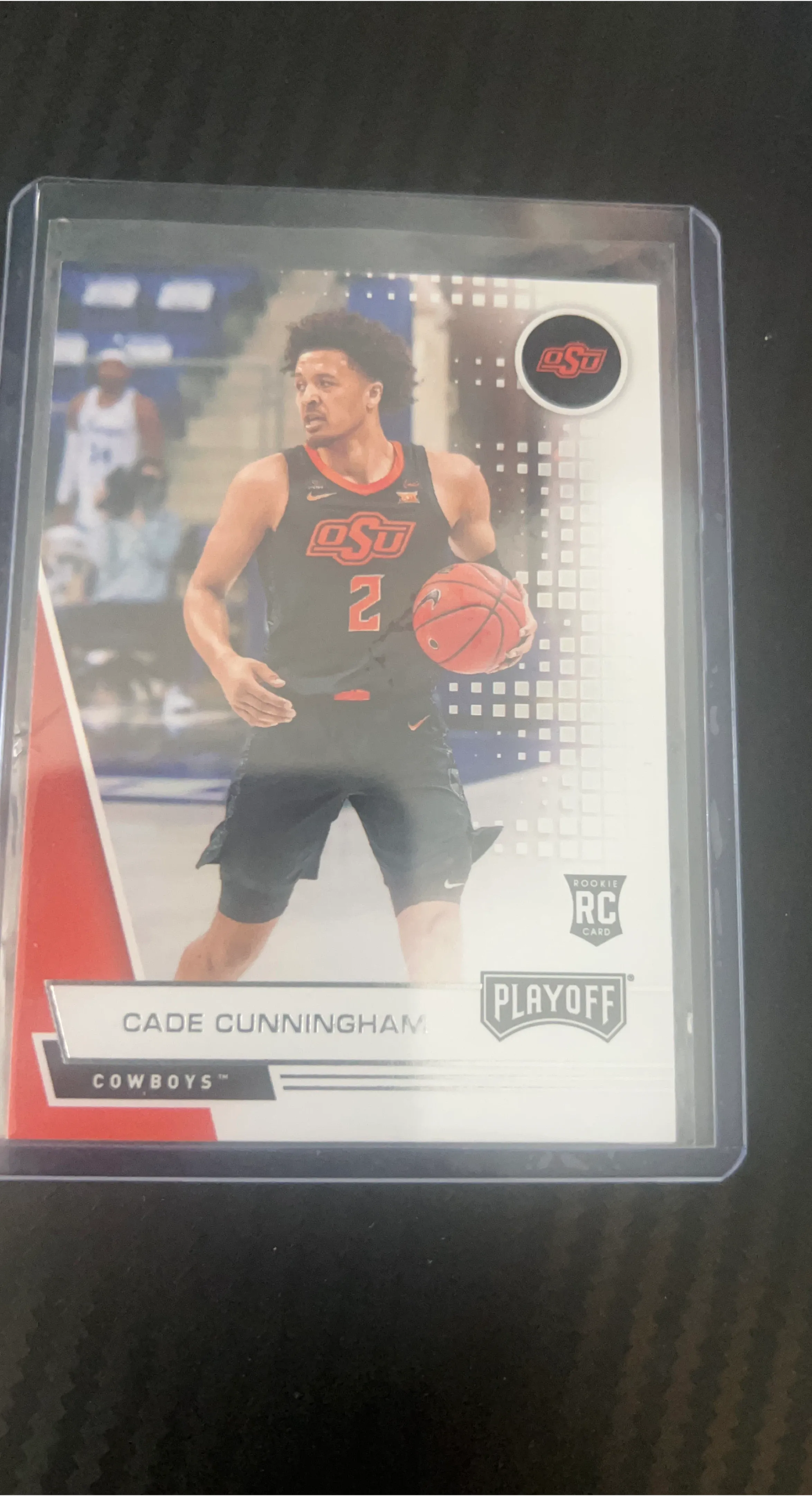 Selling a Cade Cunningham Rookie Card from the Playoff series. It features Cade in his Oklahoma State Cowboys uniform. A great addition to any basketball card collection!