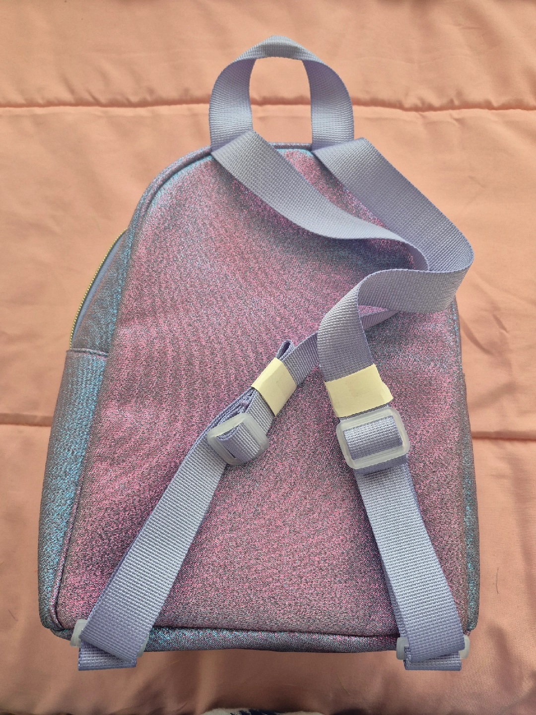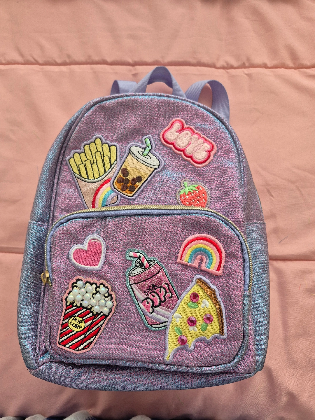 This is a super cute mini backpack! It's got a fun, shimmery purple and pink colour, and is covered in adorable food patches like fries, bubble tea, pizza, and popcorn. Perfect for a kiddo or anyone who loves a bit of whimsy!