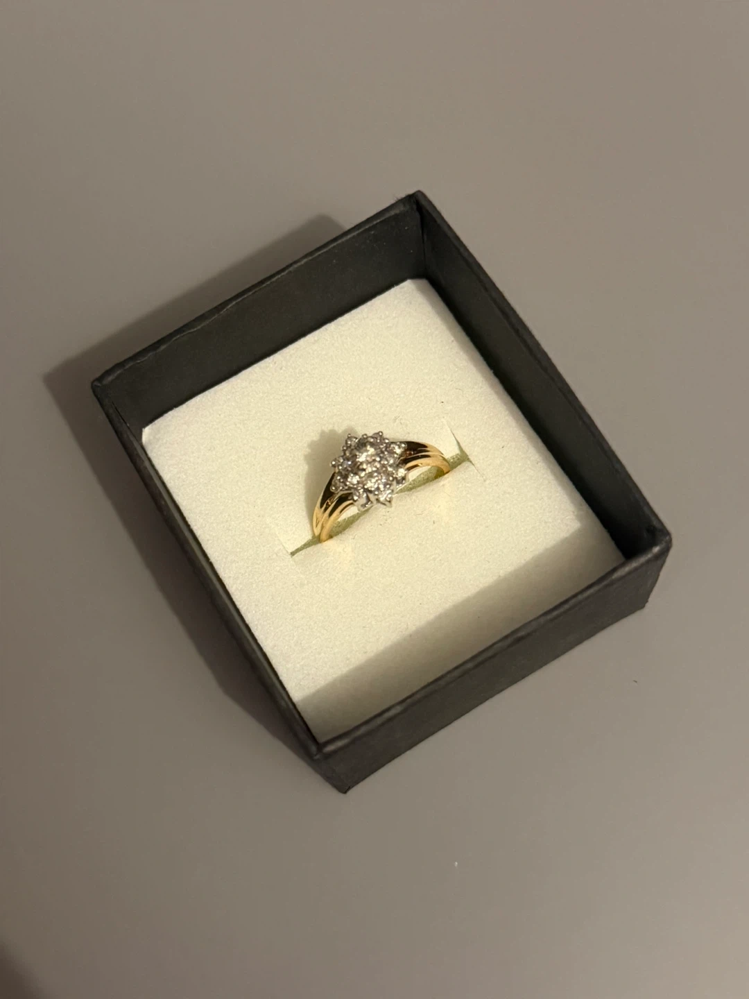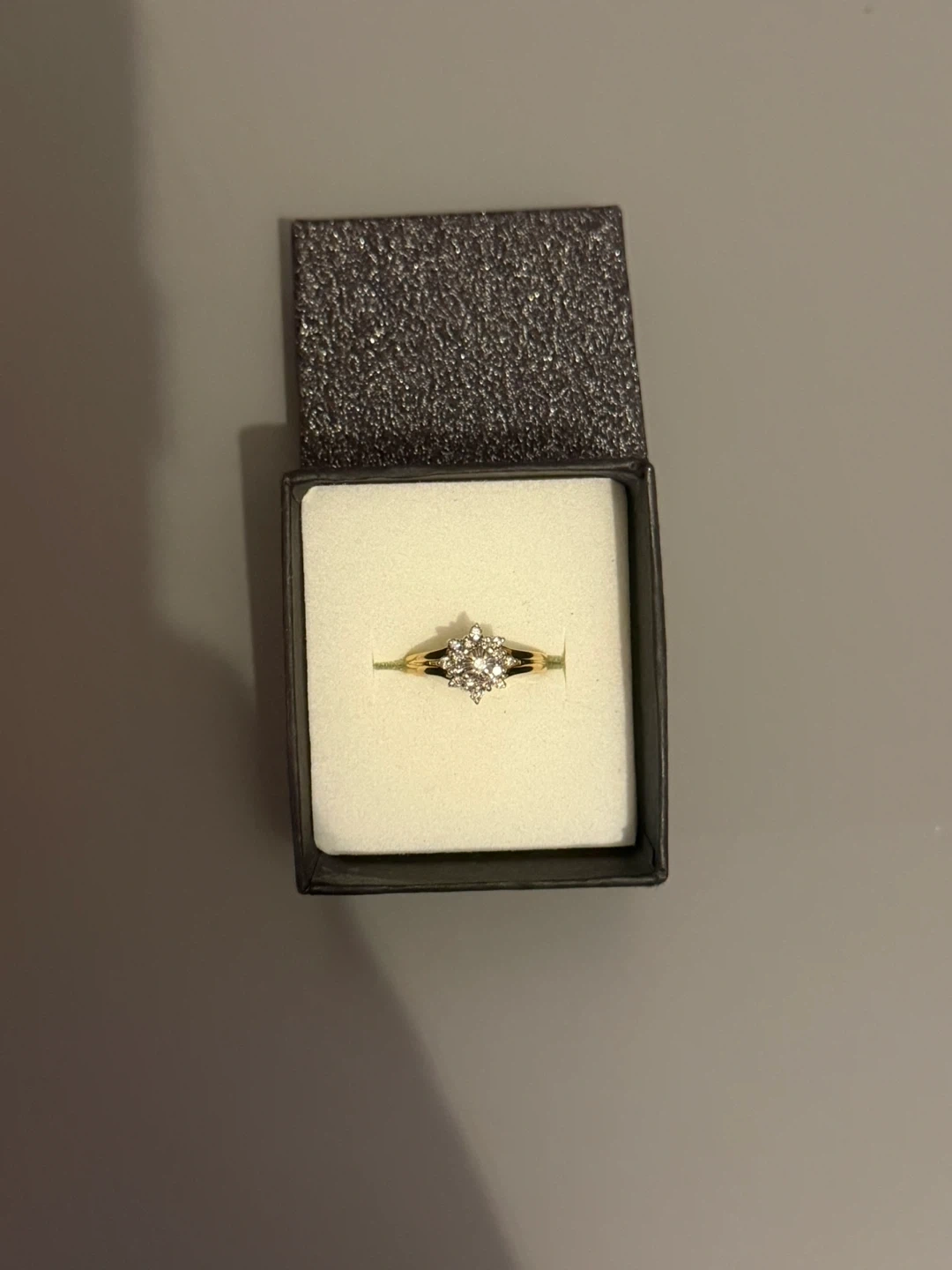 Sparkling diamond accent ring set in a 14k gold band. Comes with a black jewellery box. This piece adds a touch of elegance to any occasion!
