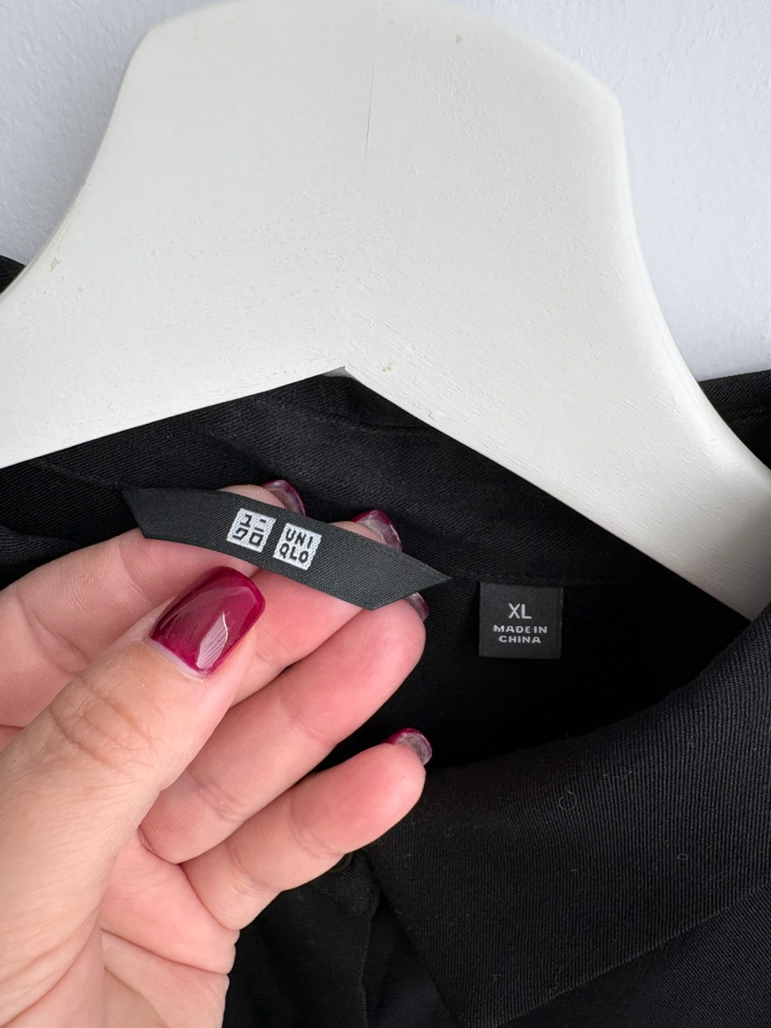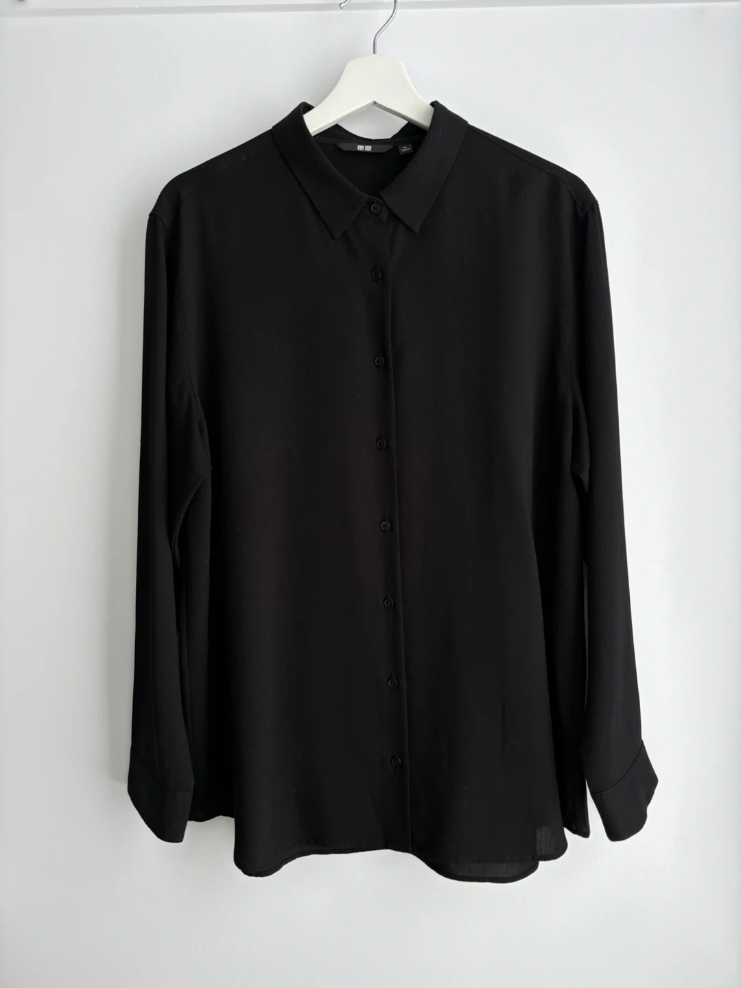 This is a classic black button-up shirt from Uniqlo. It's a size XL. The fabric feels like a lightweight blend, suitable for any season. It's a versatile piece for a smart casual or professional look!