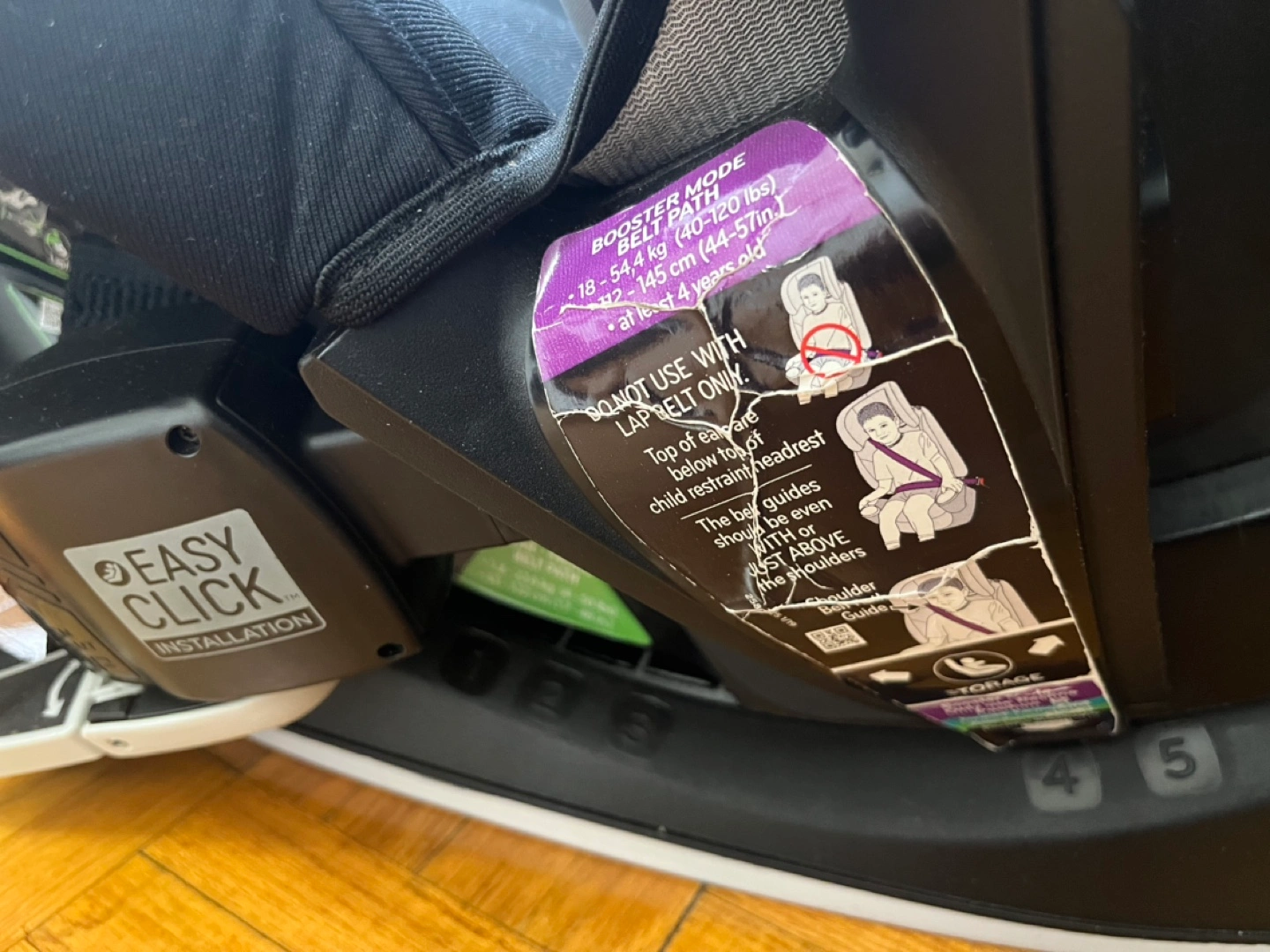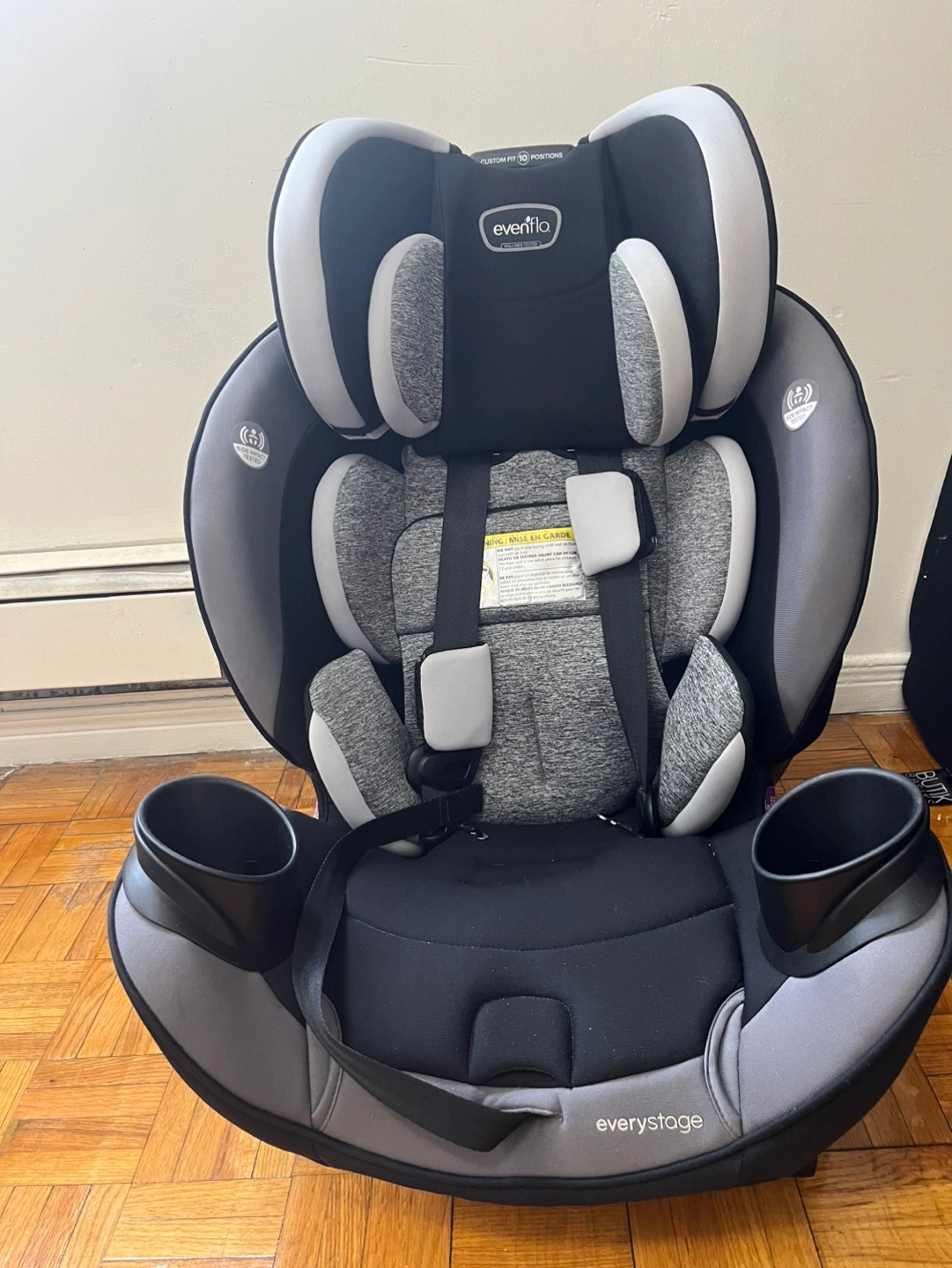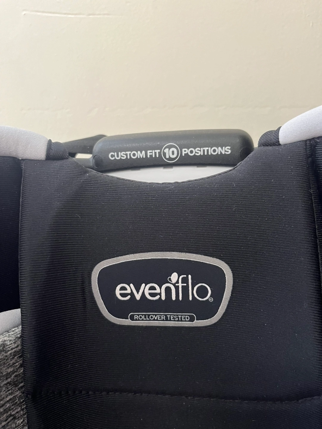 Evenflo EveryStage DLX car seat. Grey and black. All-in-one design. Cup holders. Multiple recline positions. Easy Click installation.