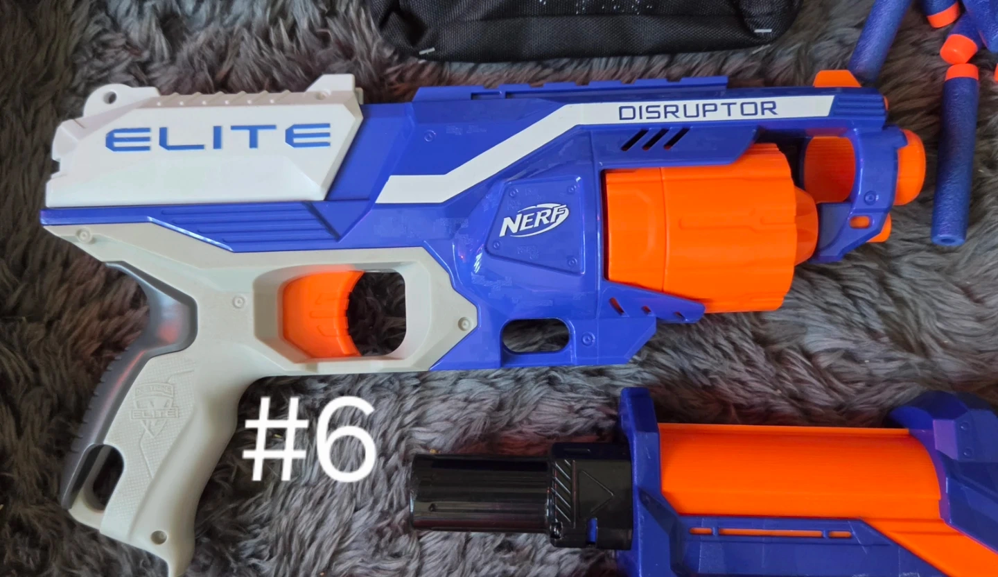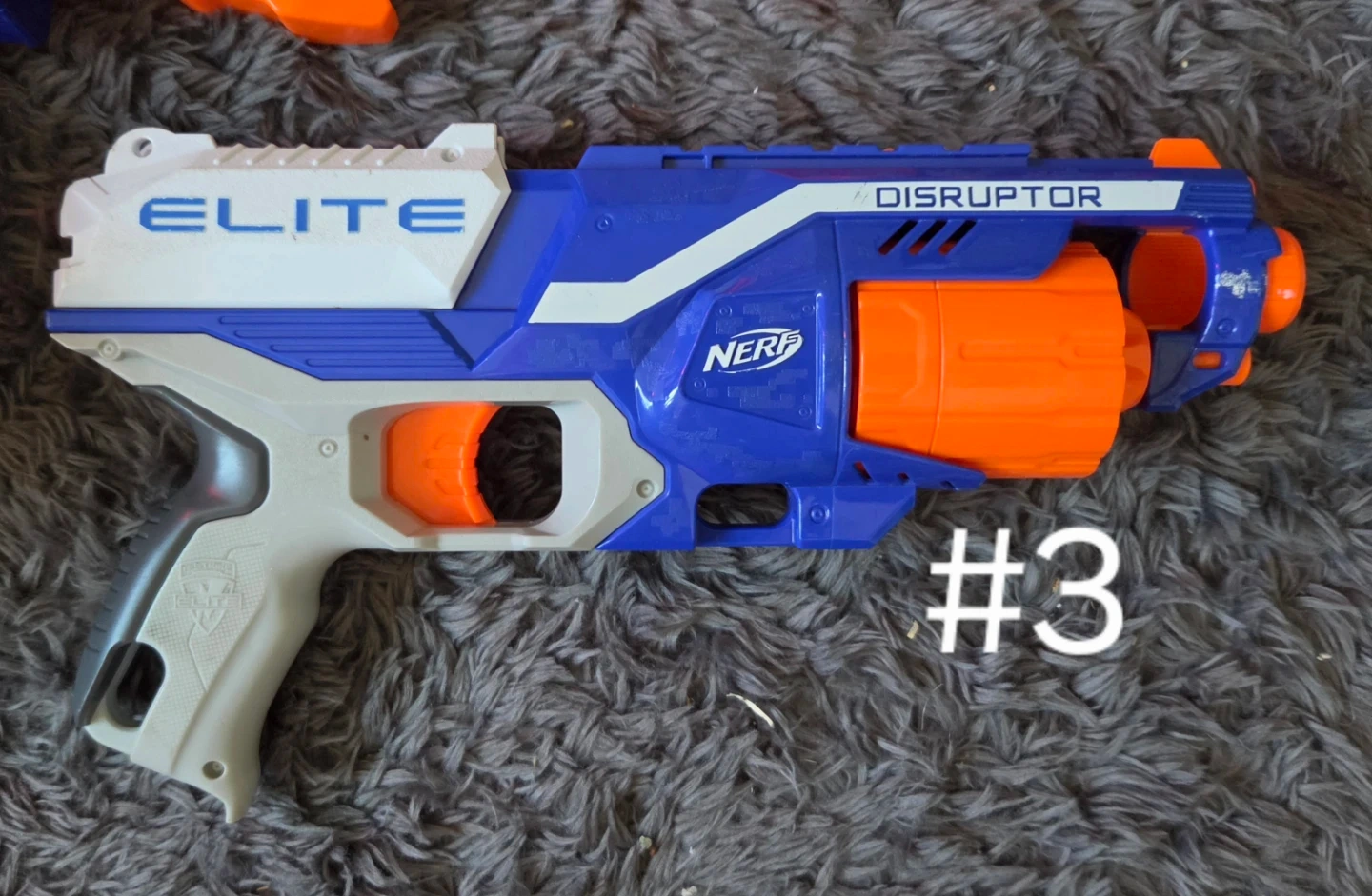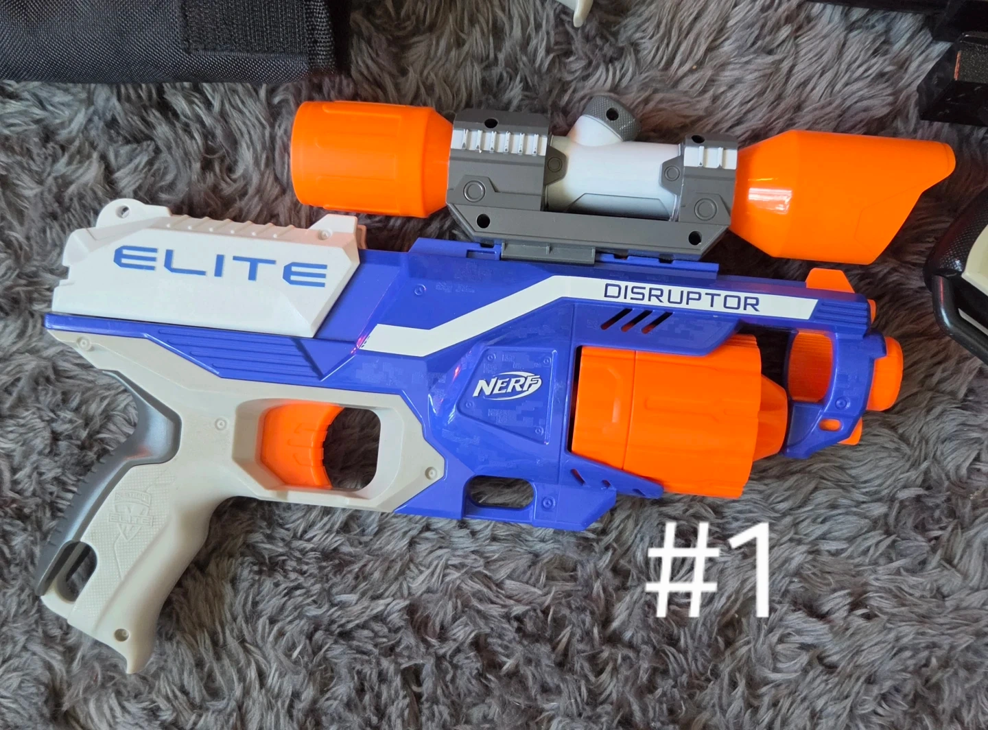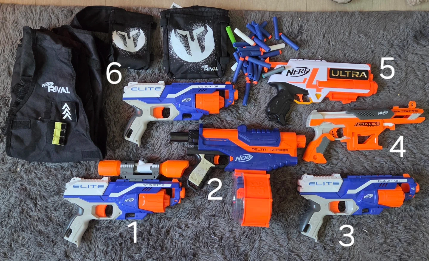 A collection of 6 nerf guns, as well as loads of bullets, 2 Nerf rivals bullet bags, and a N.R tactical vest. You can also ask for a magazine for bullets to hold them all.