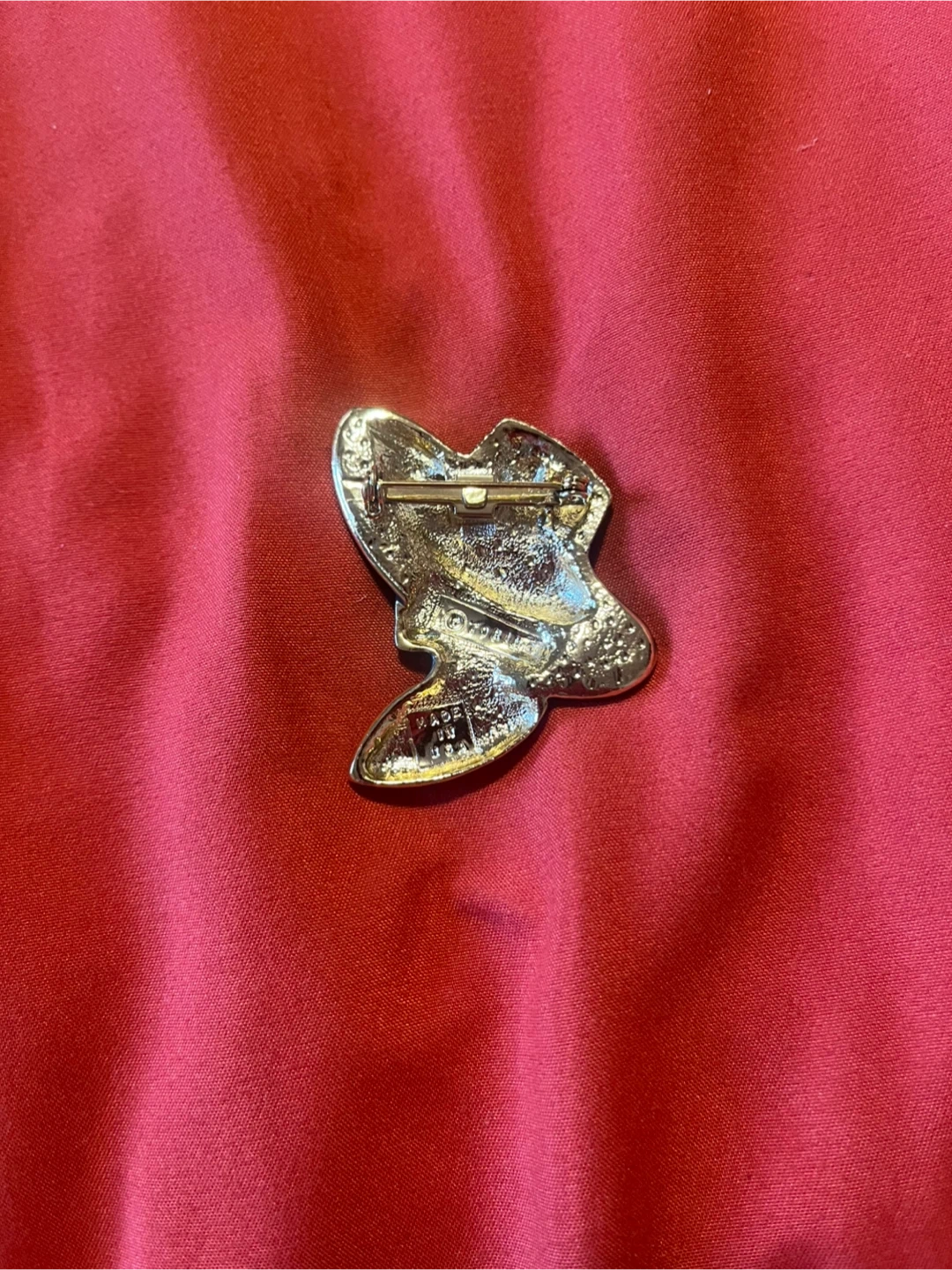 This vintage brooch features a silhouette of a lady wearing a hat. It's made of a dark material with gold-tone accents. The back has a pin closure for easy attachment.