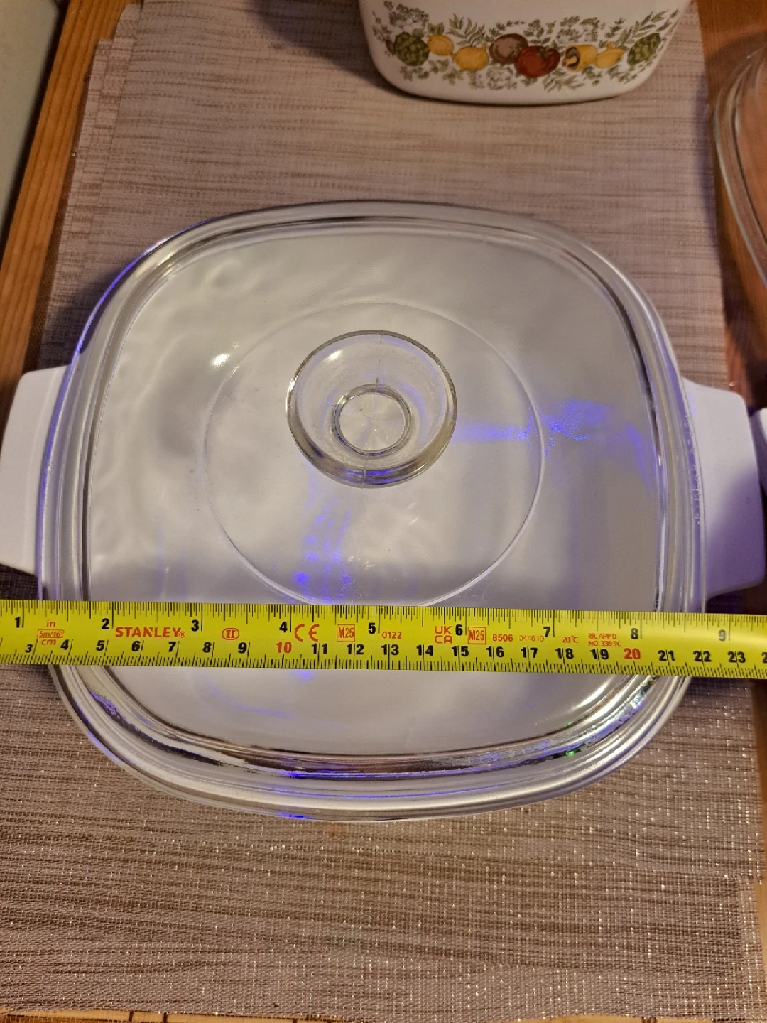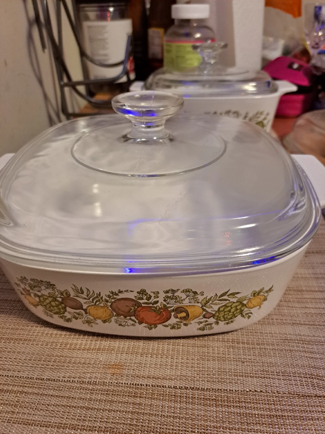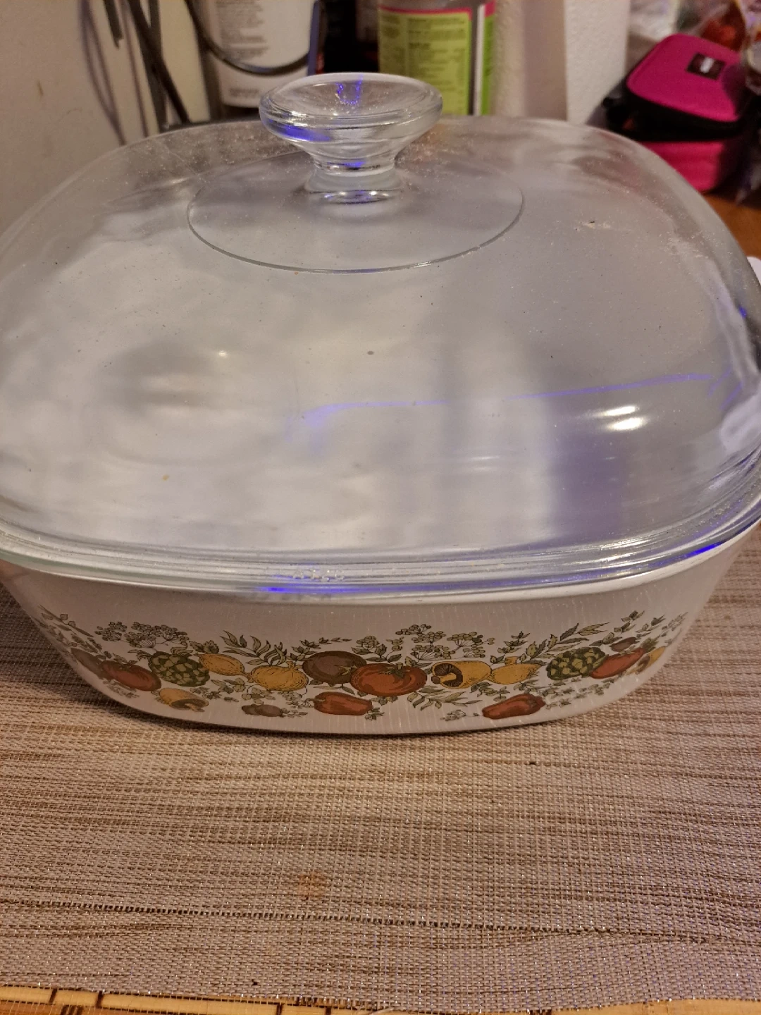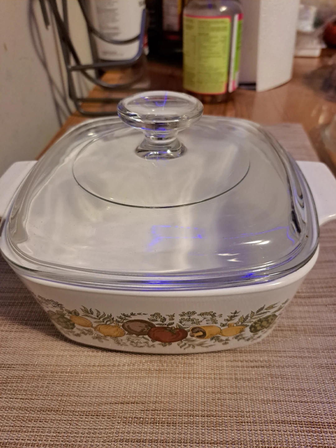 White Pyrex casserole dish with a decorative vegetable pattern. Includes a clear glass lid. Dish is square with white handles.