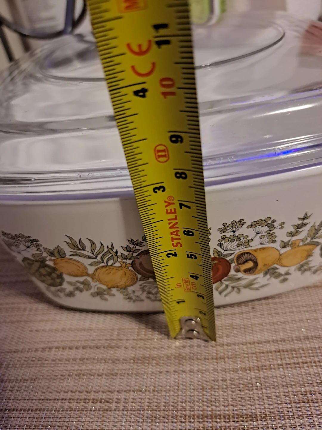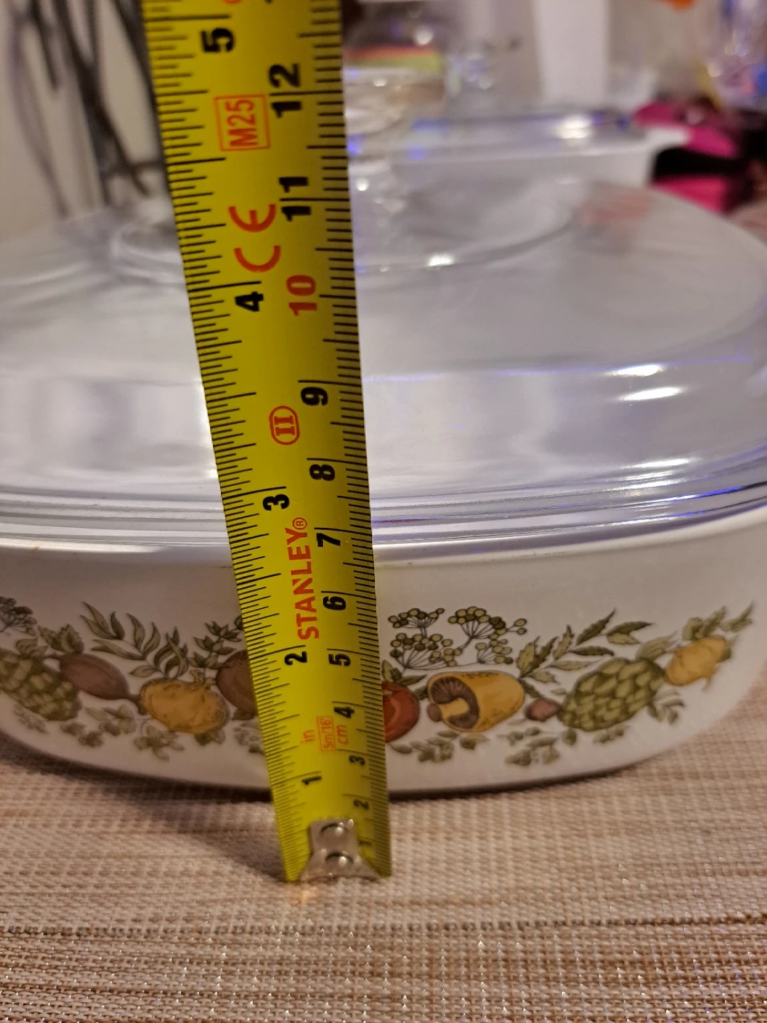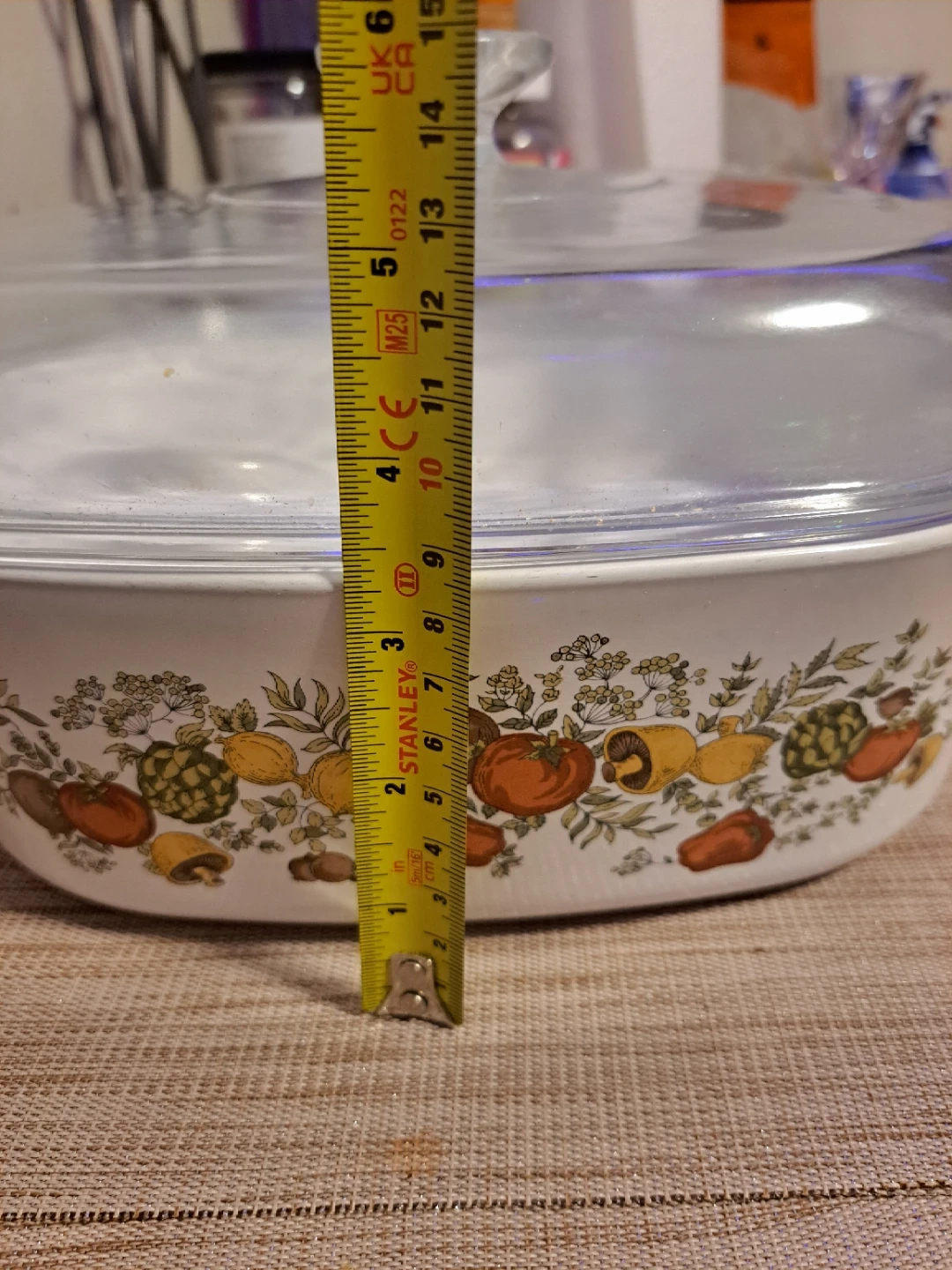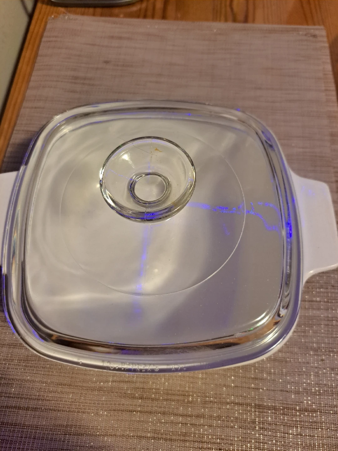 White Pyrex casserole dish with a decorative vegetable pattern. Includes a clear glass lid. Dish is square with white handles.