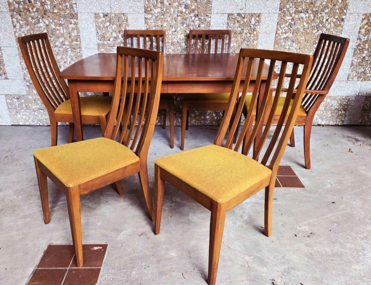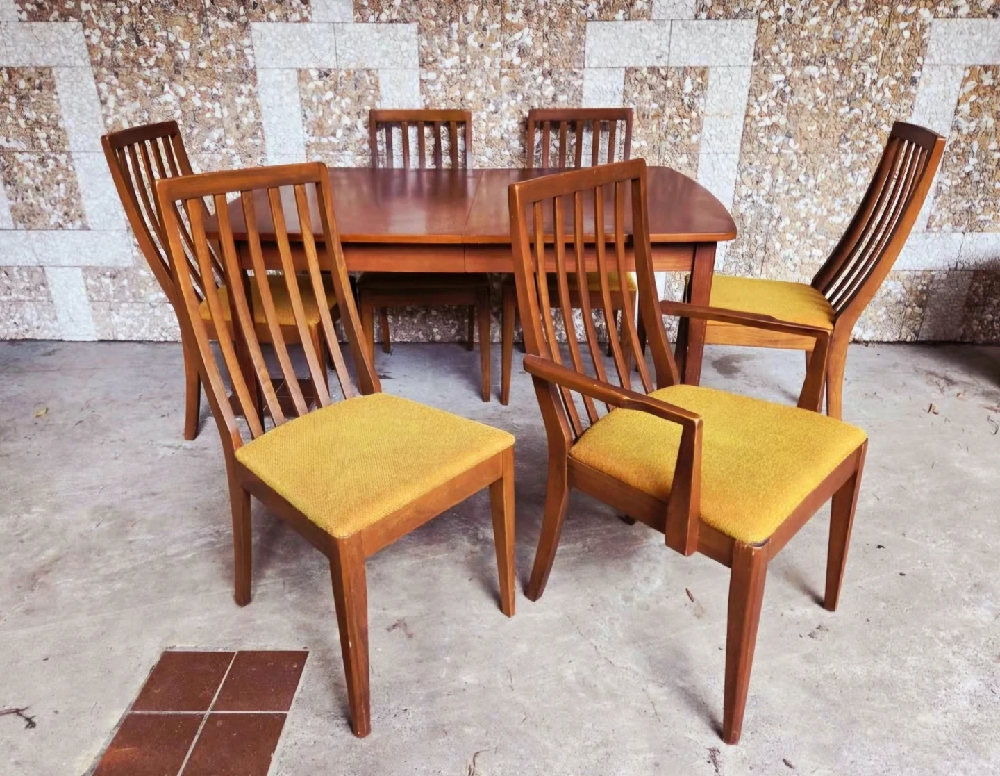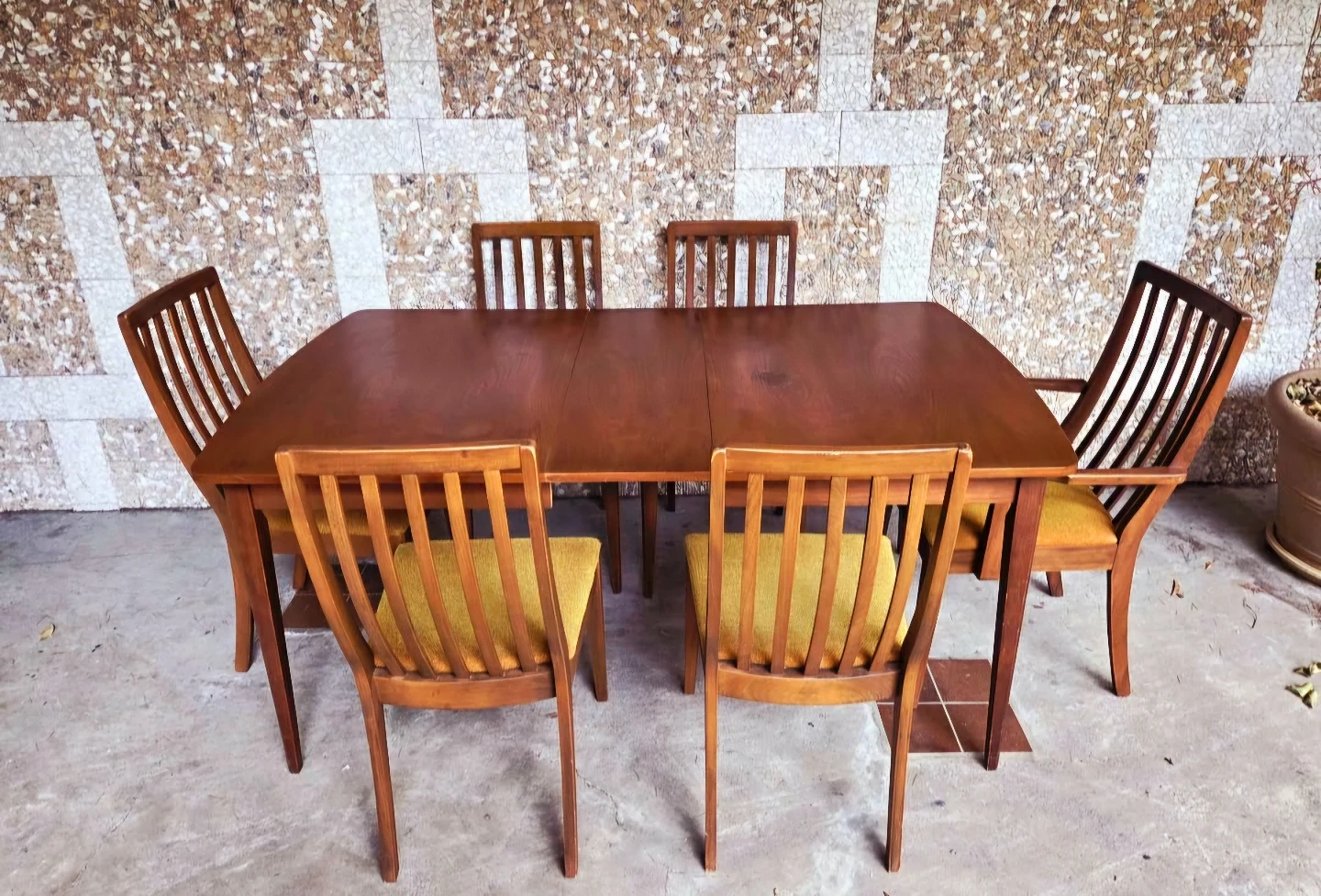 Tags: retro vintage antique 1940s 1950s 1960s 1970s mcm mid century modern furniture solid wood walnut teak cinnamon dining set gold yellow moss extendable expendable convertible westendtrends furniture vanvaluevintage film local canada set dec settee