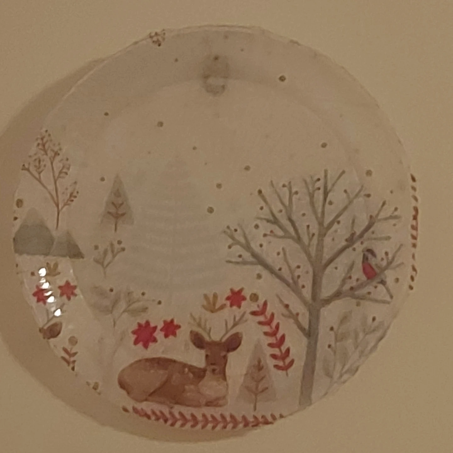 This decorative wall plate features a charming winter scene with a deer and a bird. It's a lovely addition to holiday decor. Measures approximately 10 inches in diameter. Easy to hang up on a wall.