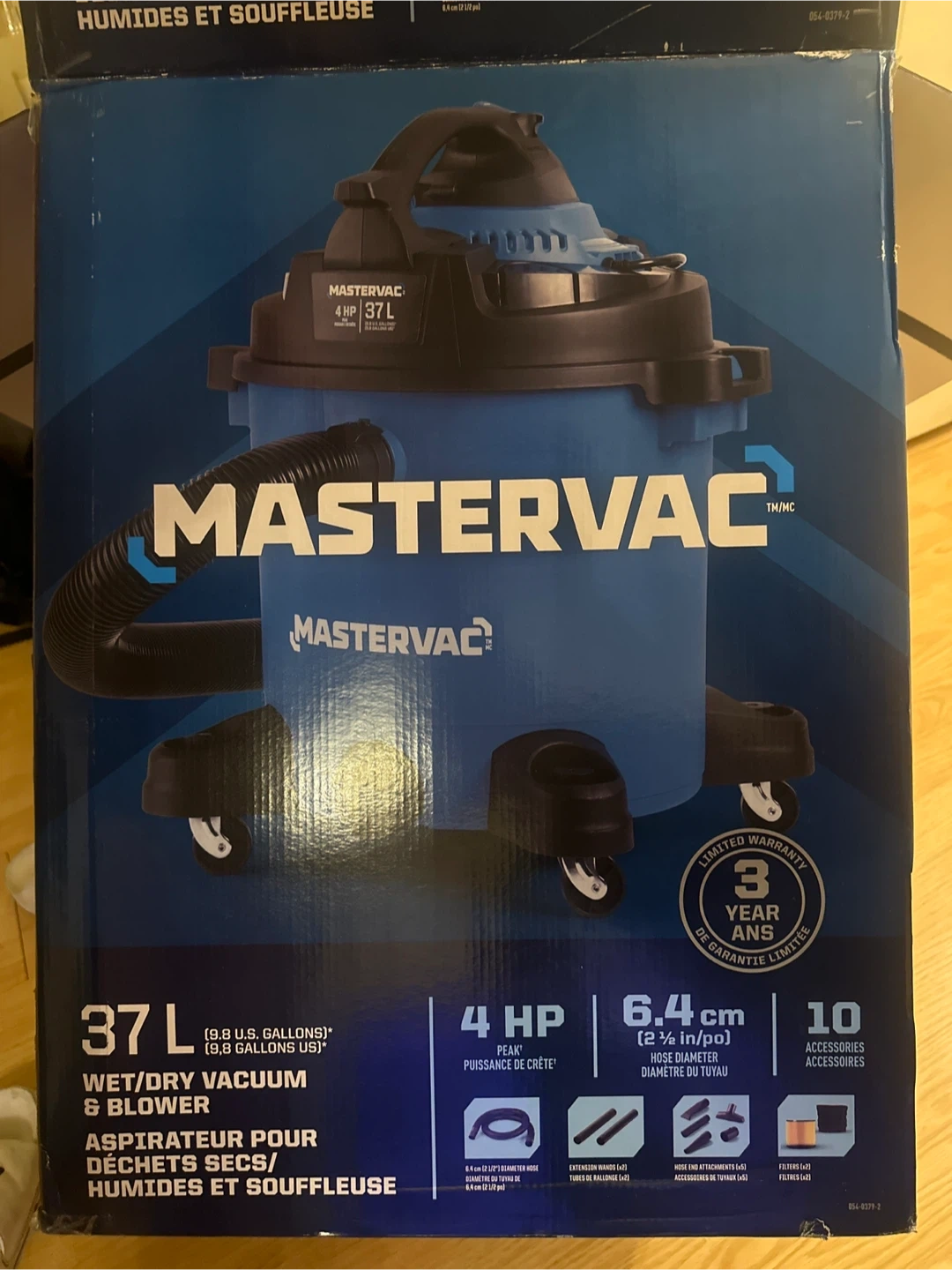 Selling a Mastervac wet/dry vacuum and blower. It has a 37L (9.8 US gallons) capacity and a 4 HP motor. Comes with 10 accessories. Great for cleaning up wet or dry messes in your home or garage