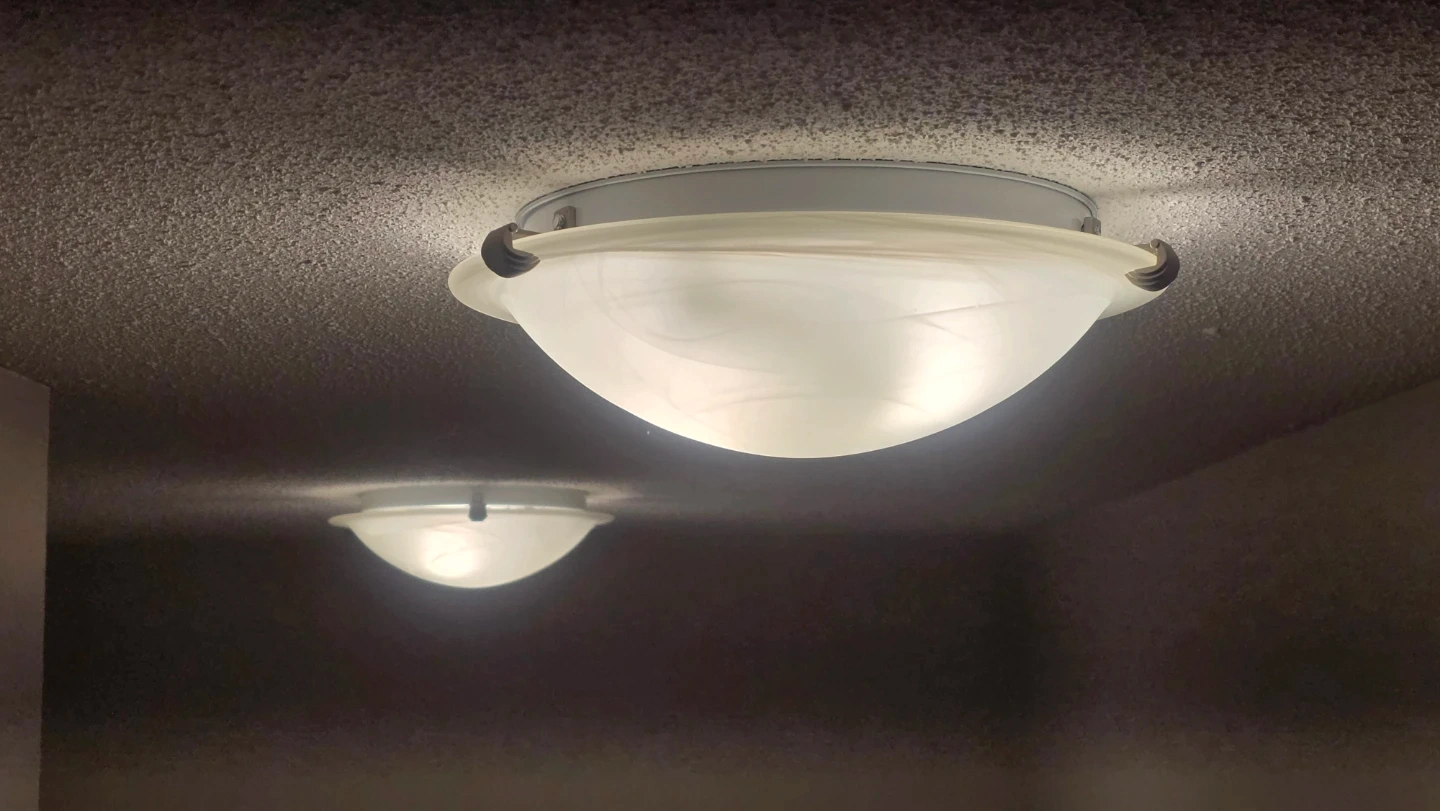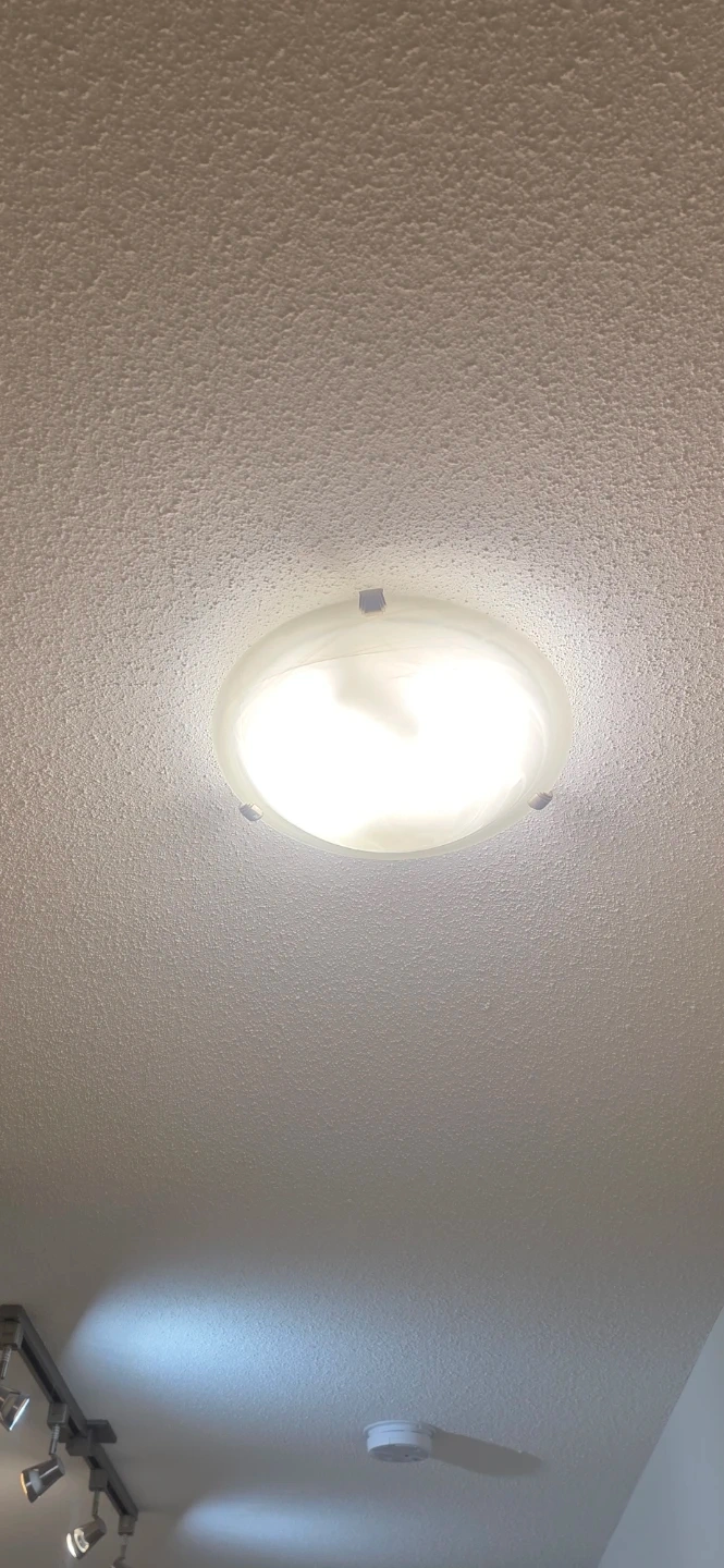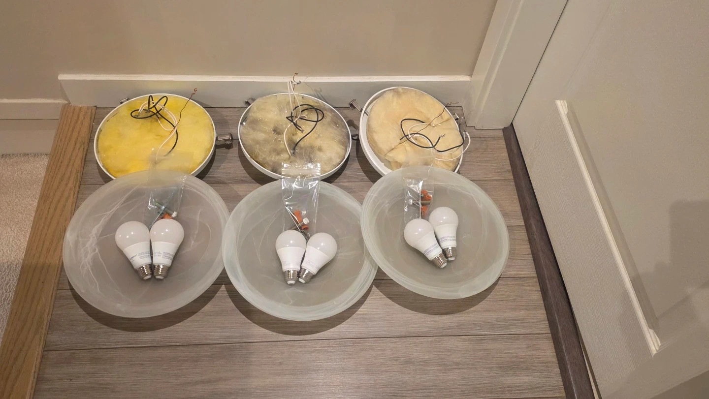 Selling a set of three frosted glass flush mount ceiling light fixtures. These lights have a swirl pattern in the glass and come with LED bulbs. Includes hardware for installation.