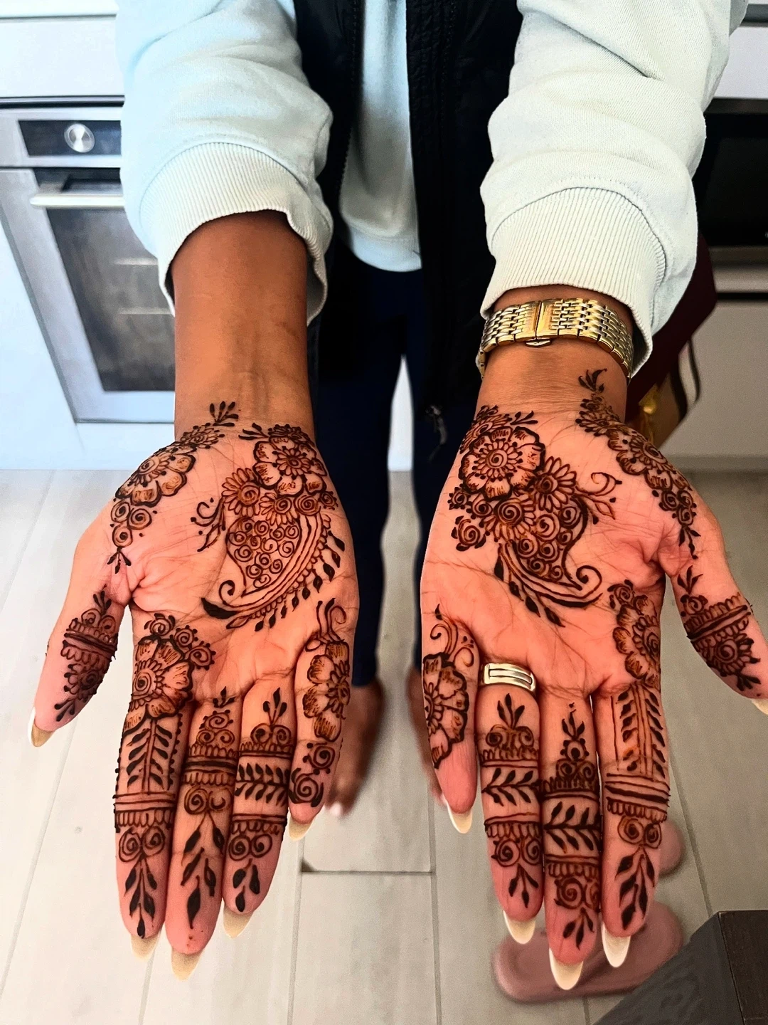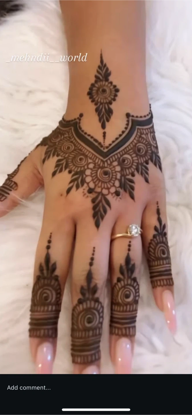 Beautiful EID henna designs applied to hands. Options include simple mandala with half fingers for $15 per side, full hands with tips for $20, four sides 60$. These designs are great for events and celebrations!