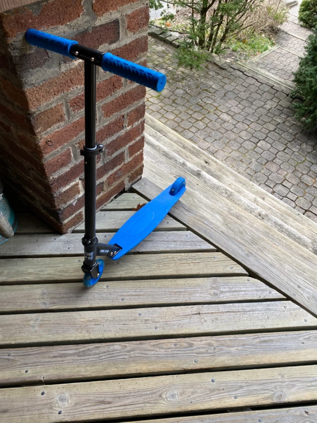 This is a blue 2 wheel scooter with blue grips. It's built for fun and easy rides. There are 4 lower adjustable heights of 2 inches each. In the photo, it is at its highest point measuring 29 inches. In excellent condition.