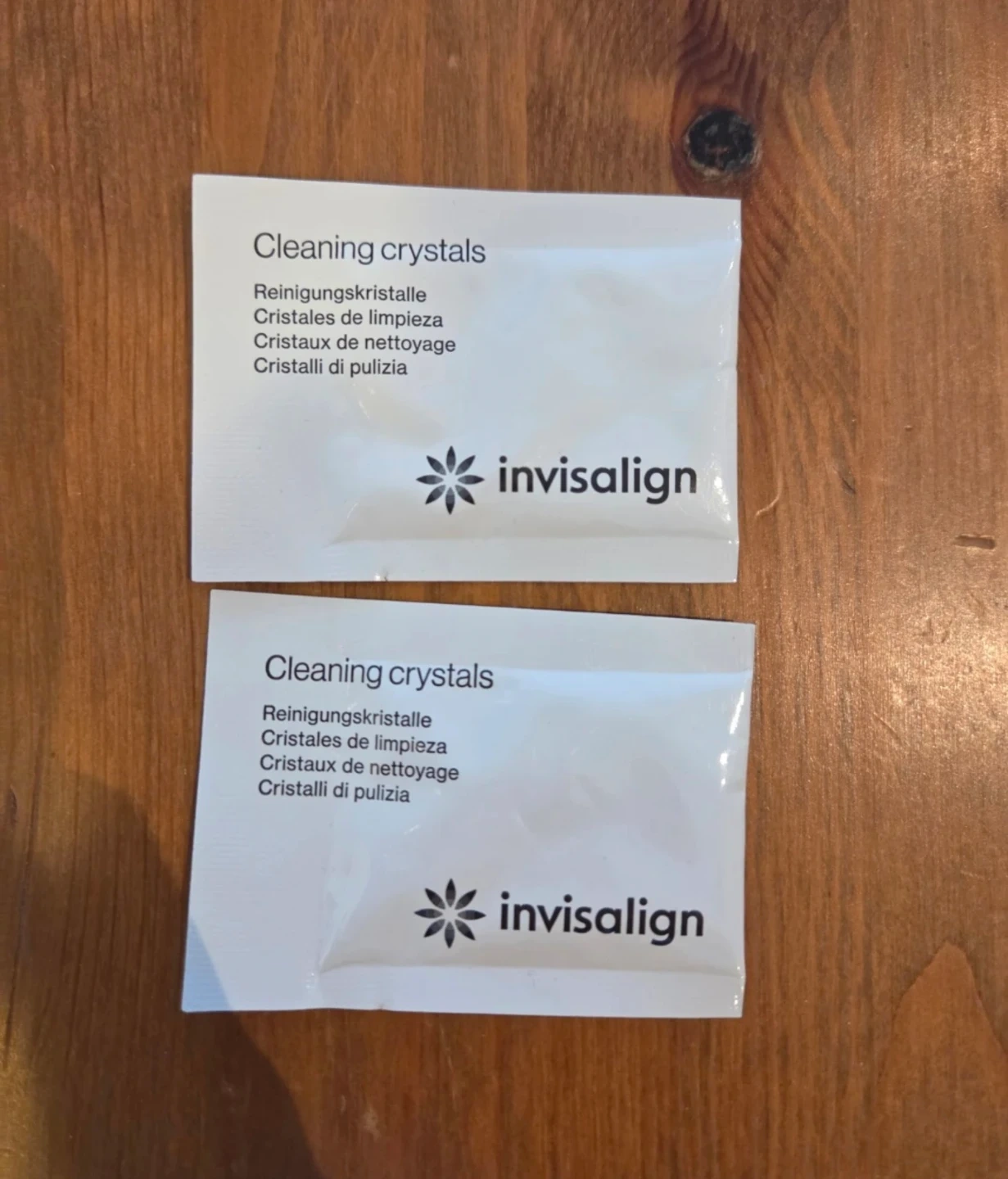 These are Invisalign cleaning crystals, perfect for keeping your aligners fresh. They come in a convenient two-pack. Use them to help maintain the cleanliness of your dental aligners.