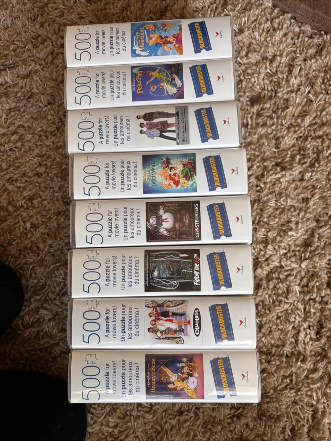 Selling a set of Blockbuster movie-themed puzzles! Each puzzle has 500 pieces and features classic movies like: