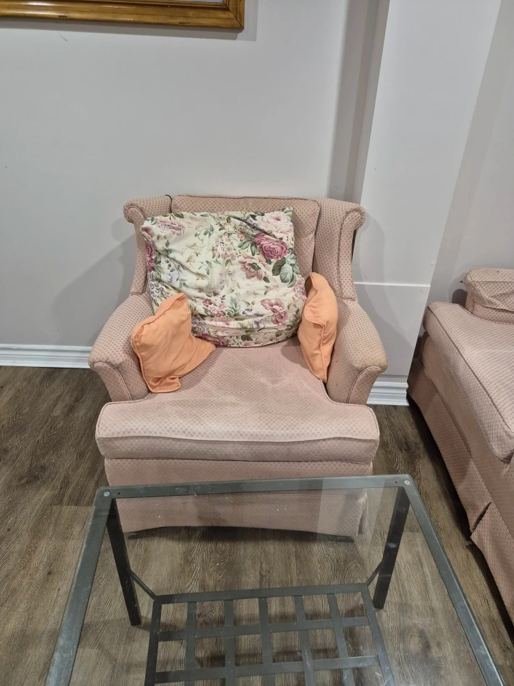 A vintage sofa and armchair set. The set has a classic design with a comfortable feel. Perfect for adding a touch of retro charm to your living room or den. Its a pet and smoke free.