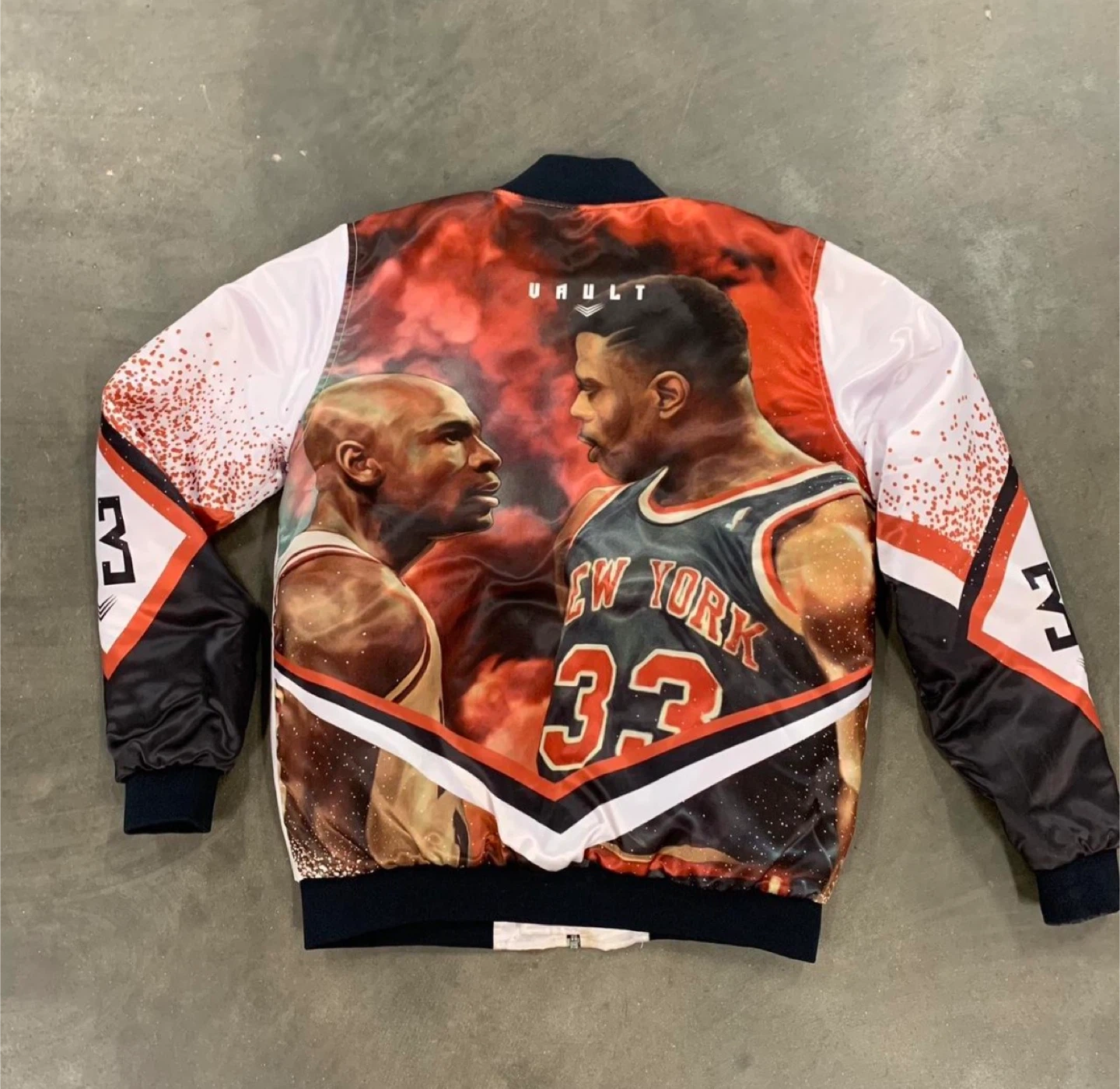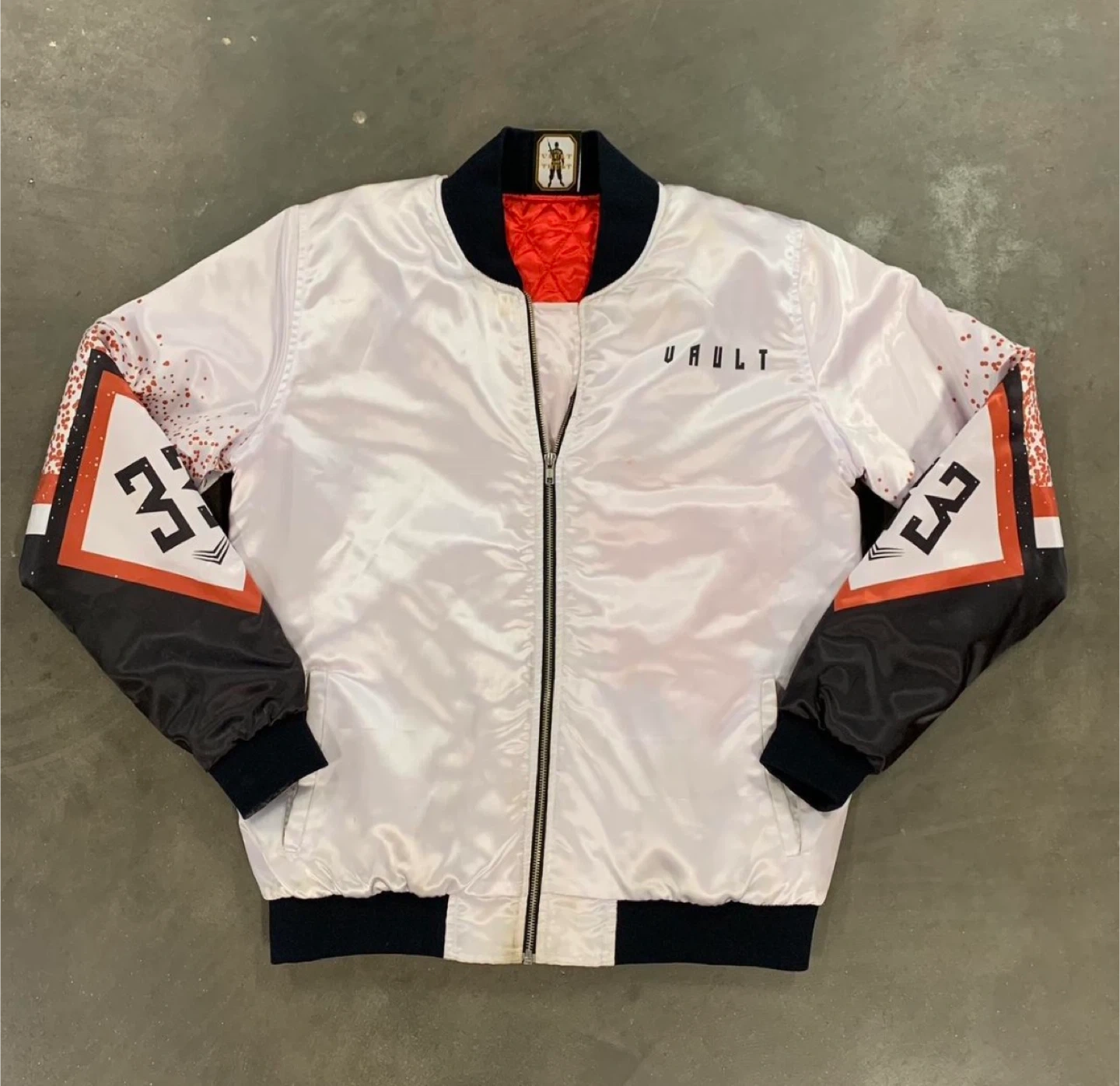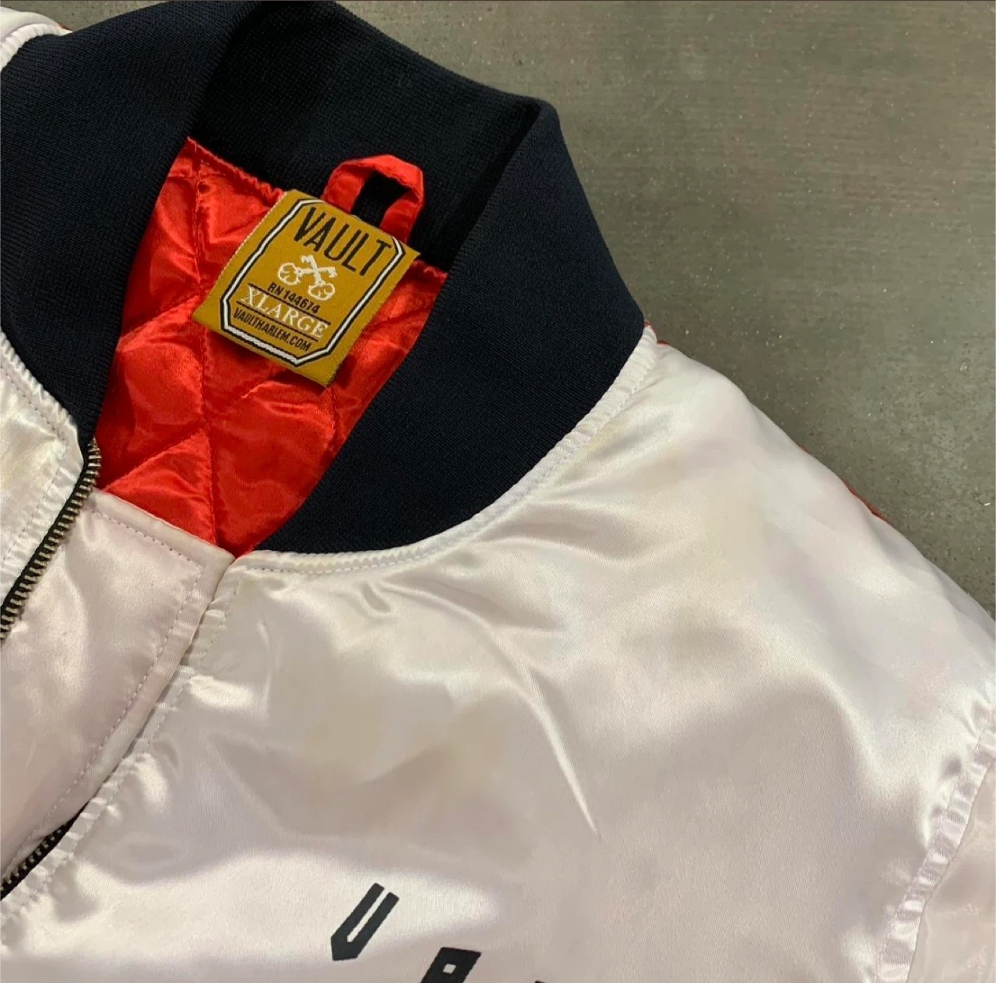 VAULT bomber jacket with a white satin exterior and red quilted lining. Features graphics on the sleeves and a large graphic print on the back. Size is XLarge.