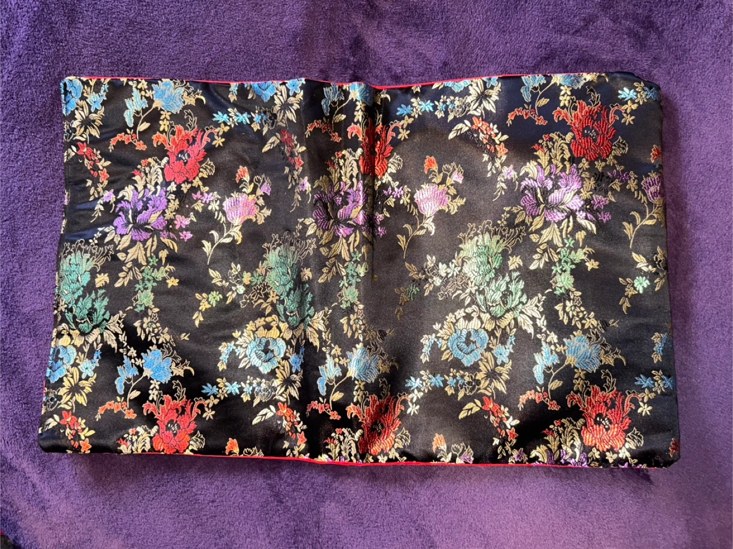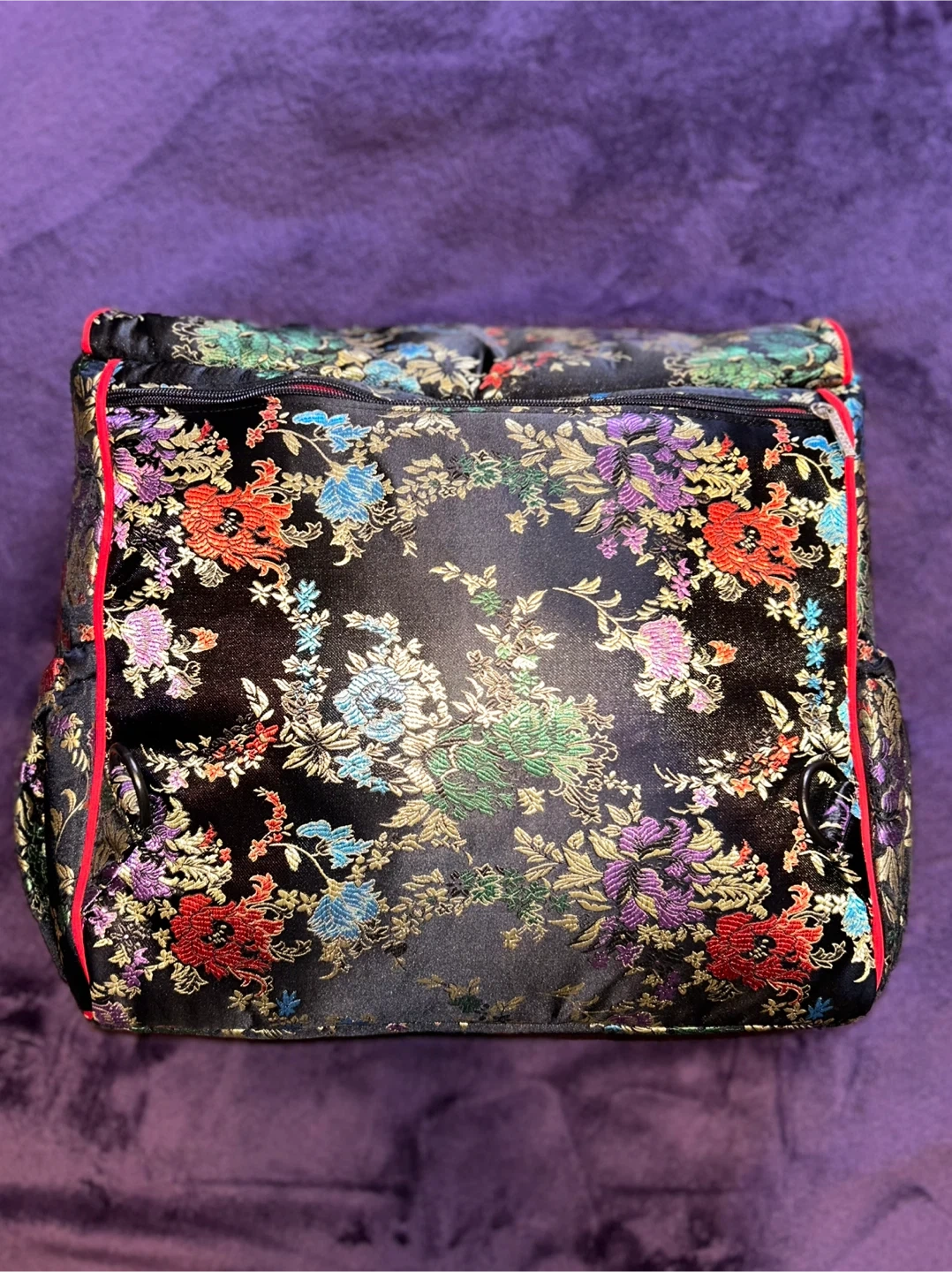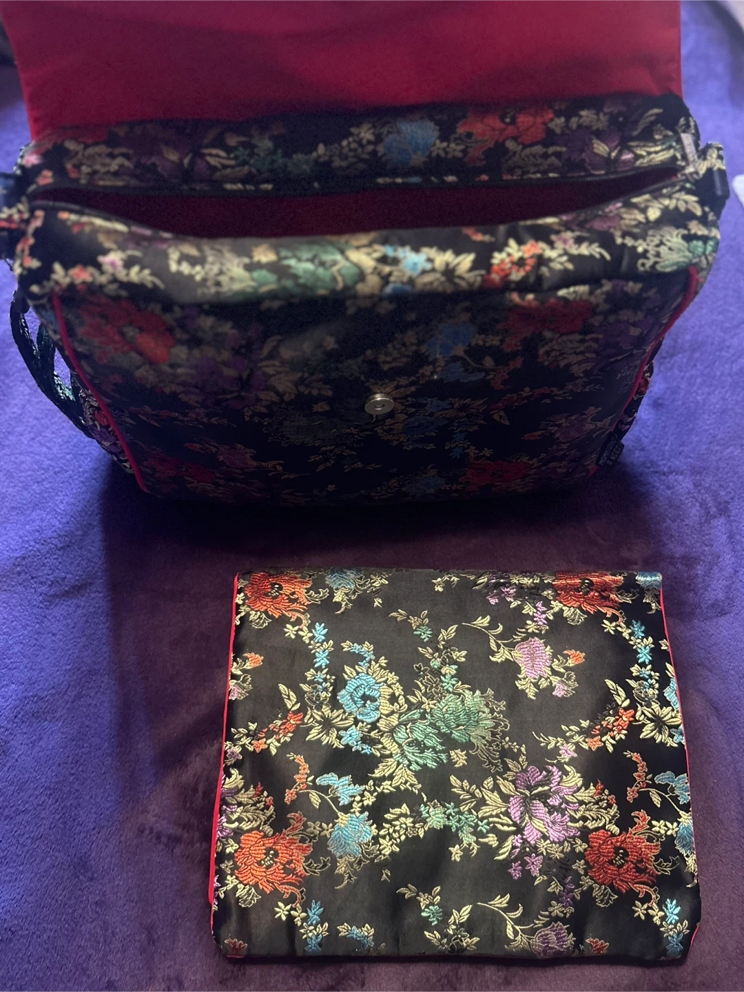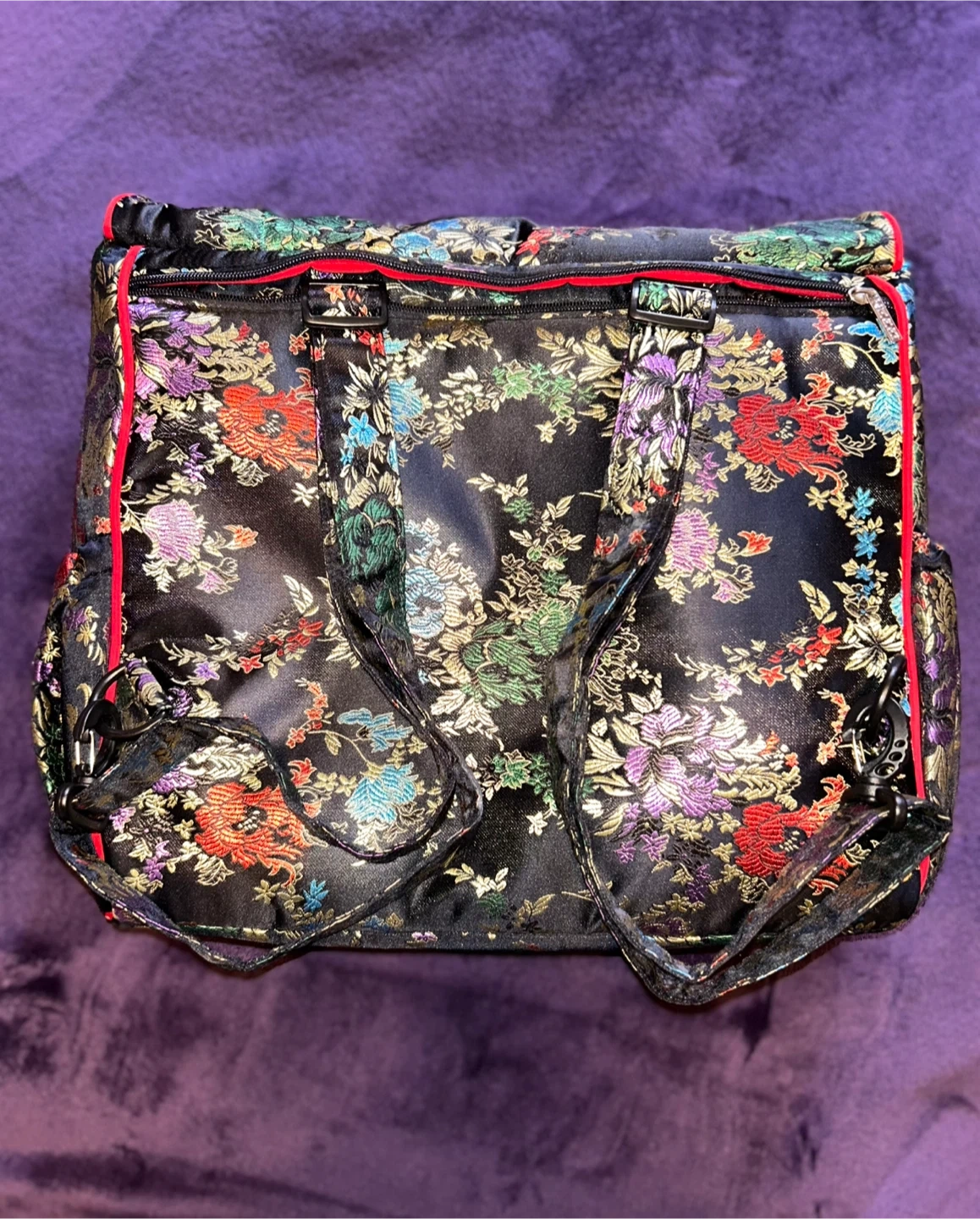 New black diaper/crossbody/backpack bag featuring a floral pattern and red trim. It comes with a matching changing pad. This bag has a roomy interior and a secure zipper and snap closure. Also is changeable into a backpack! This bag is highly versatile and will fit all your needs!