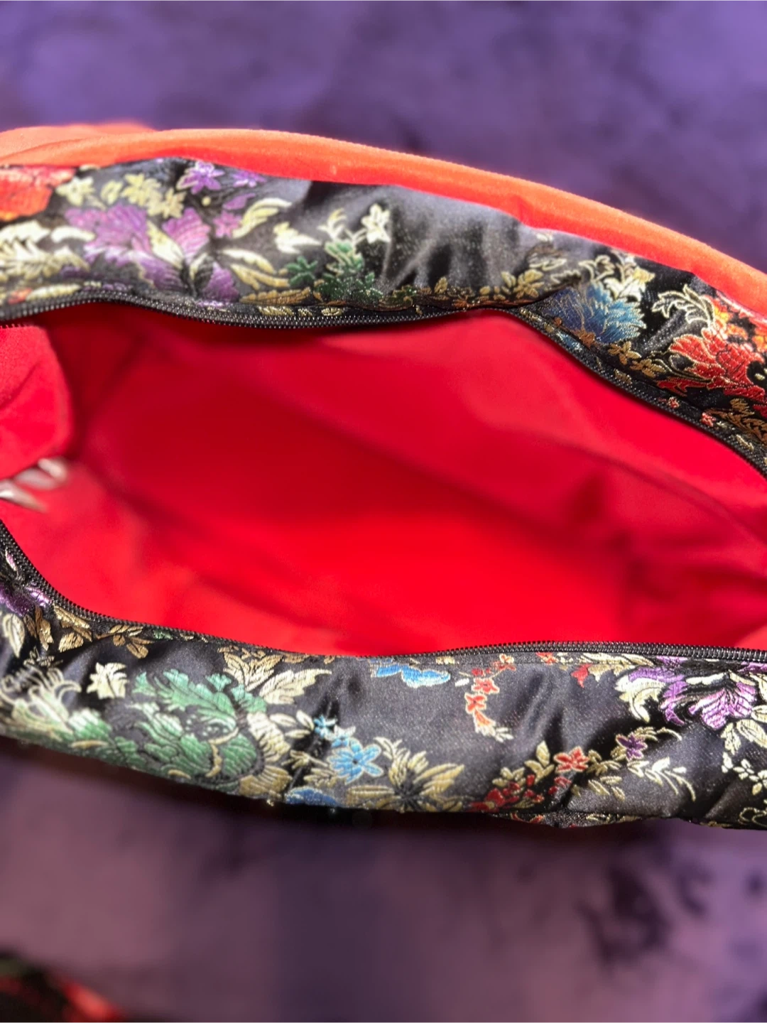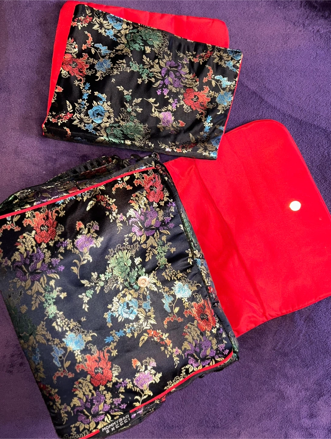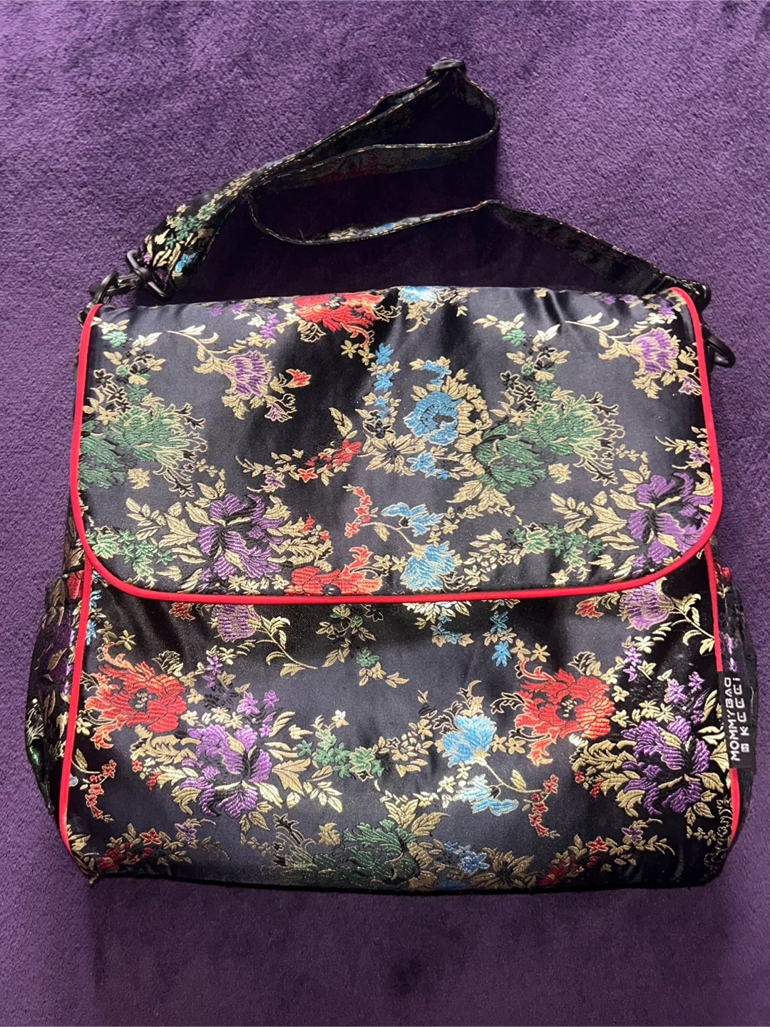 New black diaper/crossbody/backpack bag featuring a floral pattern and red trim. It comes with a matching changing pad. This bag has a roomy interior and a secure zipper and snap closure. Also is changeable into a backpack! This bag is highly versatile and will fit all your needs!