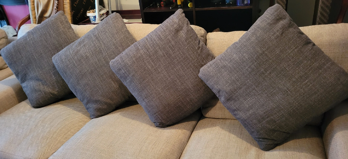 Selling a set of 4 grey throw pillows. They're in great condition and would look lovely on a couch or bed. They are a nice neutral colour that would match almost any decor. Perfect for adding a bit of comfort and style to your home! $20 Each. Let me know if you are interested. Thanks.