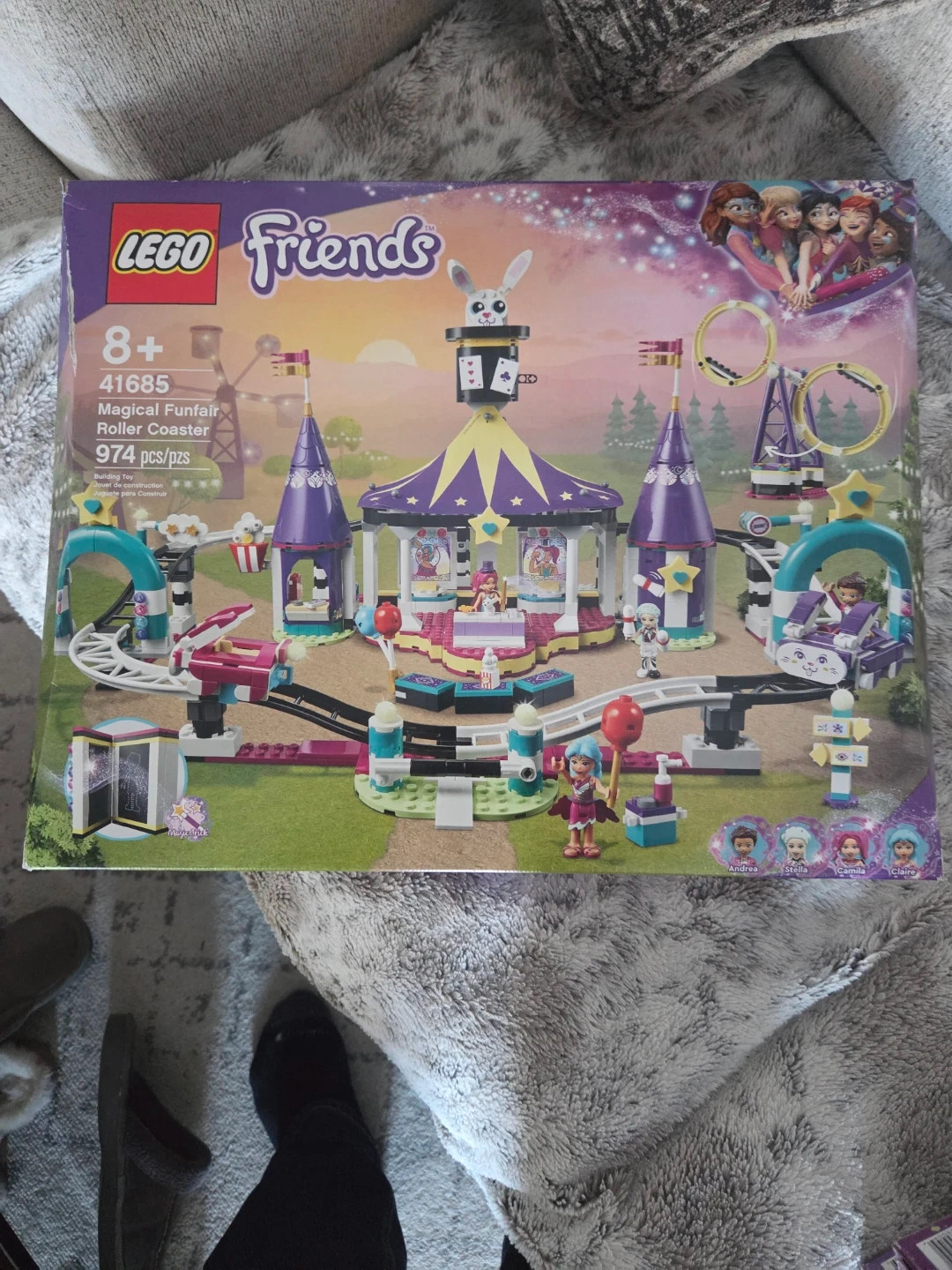 This LEGO Friends Magical Funfair Roller Coaster set includes 974 pieces. It's recommended for ages 8 and up and features Andrea, Stella, and Claire. It's a fun building toy for imaginative play!