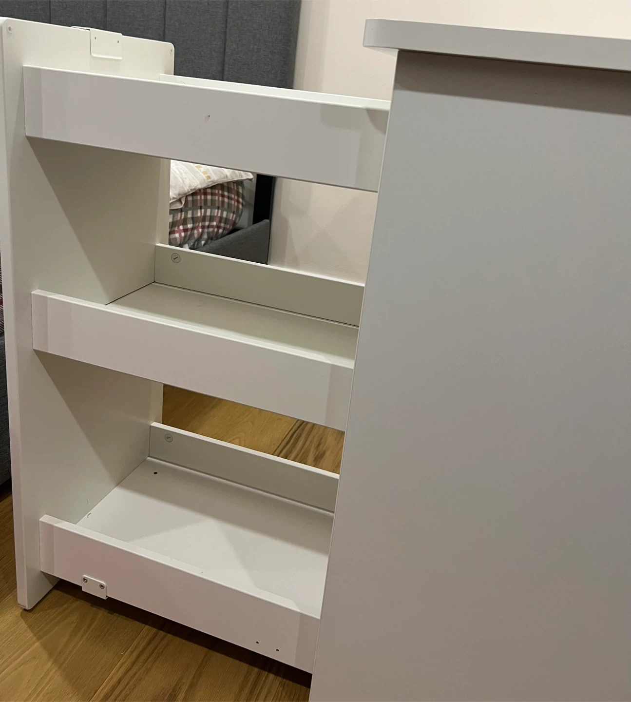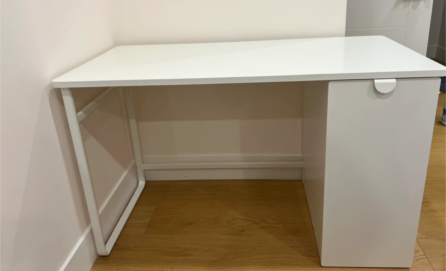 This is a clean, white desk with a built-in storage unit on the right side. It's perfect for a home office or student or can be use as a manicure table . The desk features a sturdy frame and a smooth writing surface.