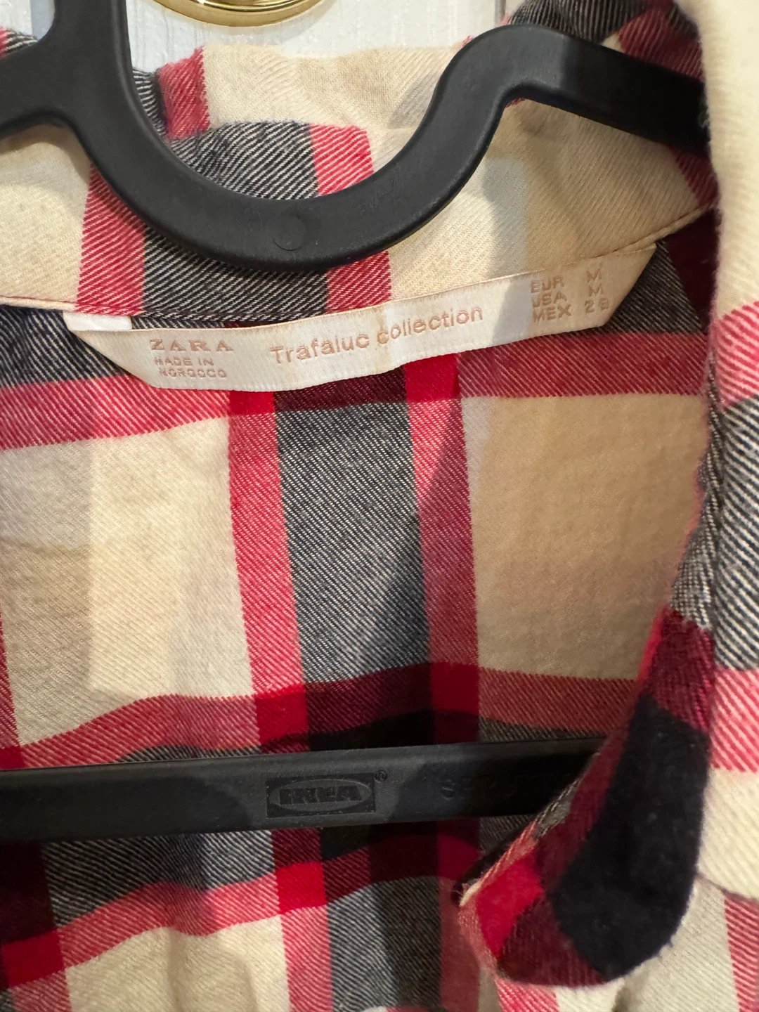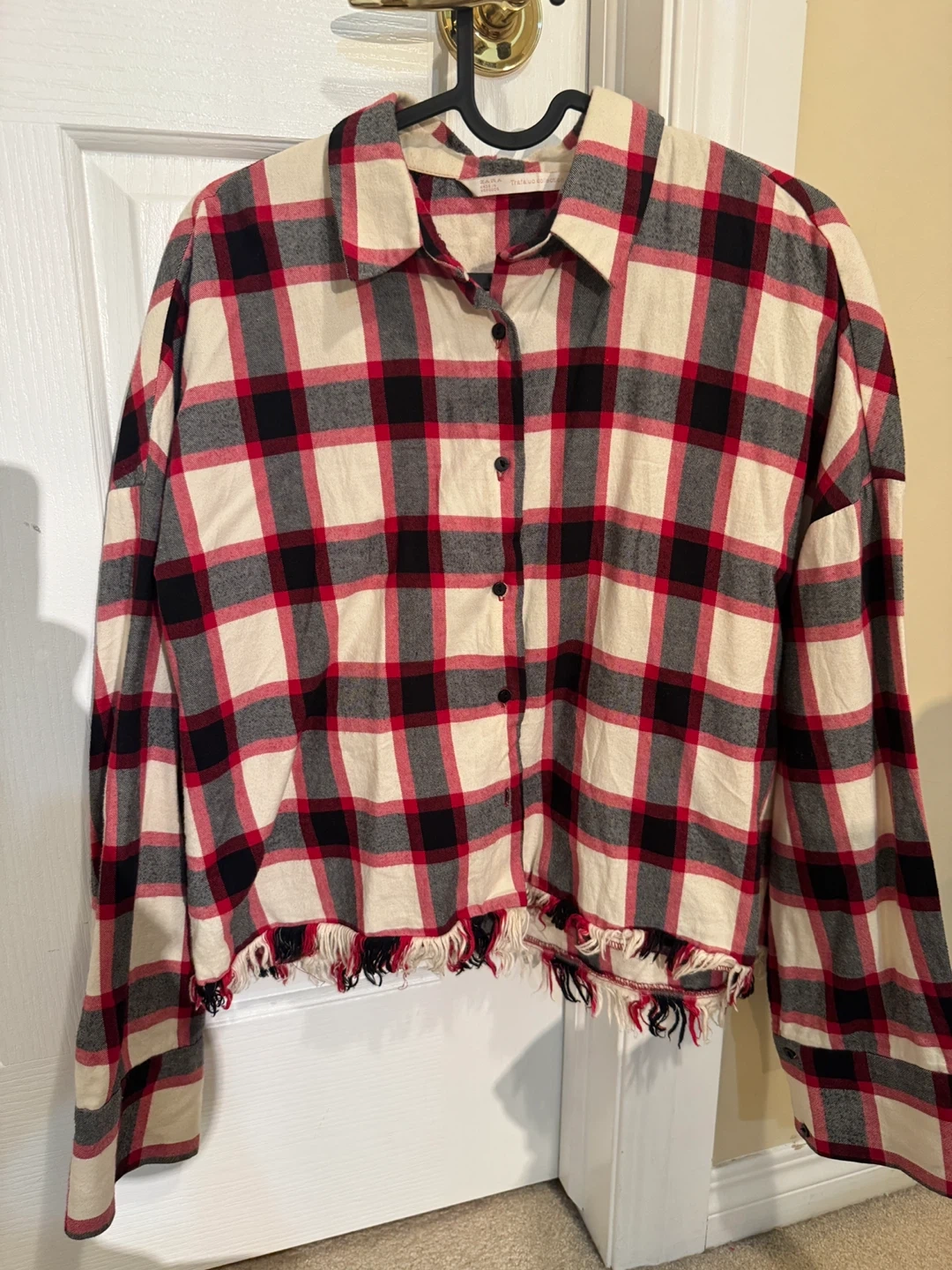 Selling a Zara Trafaluc Collection flannel women’s shirt in size medium. It features a red, black, and cream plaid pattern. It has a frayed hem for a stylish, casual look