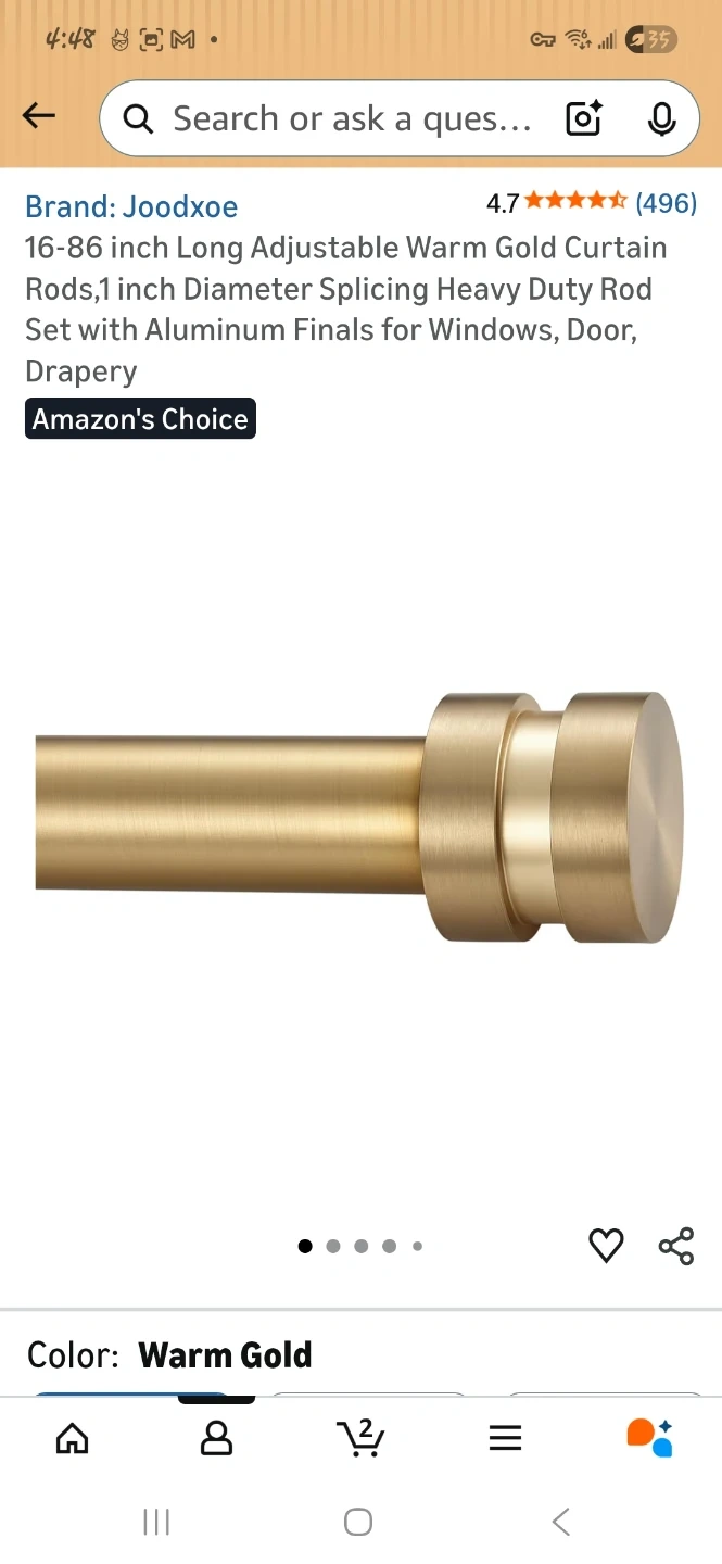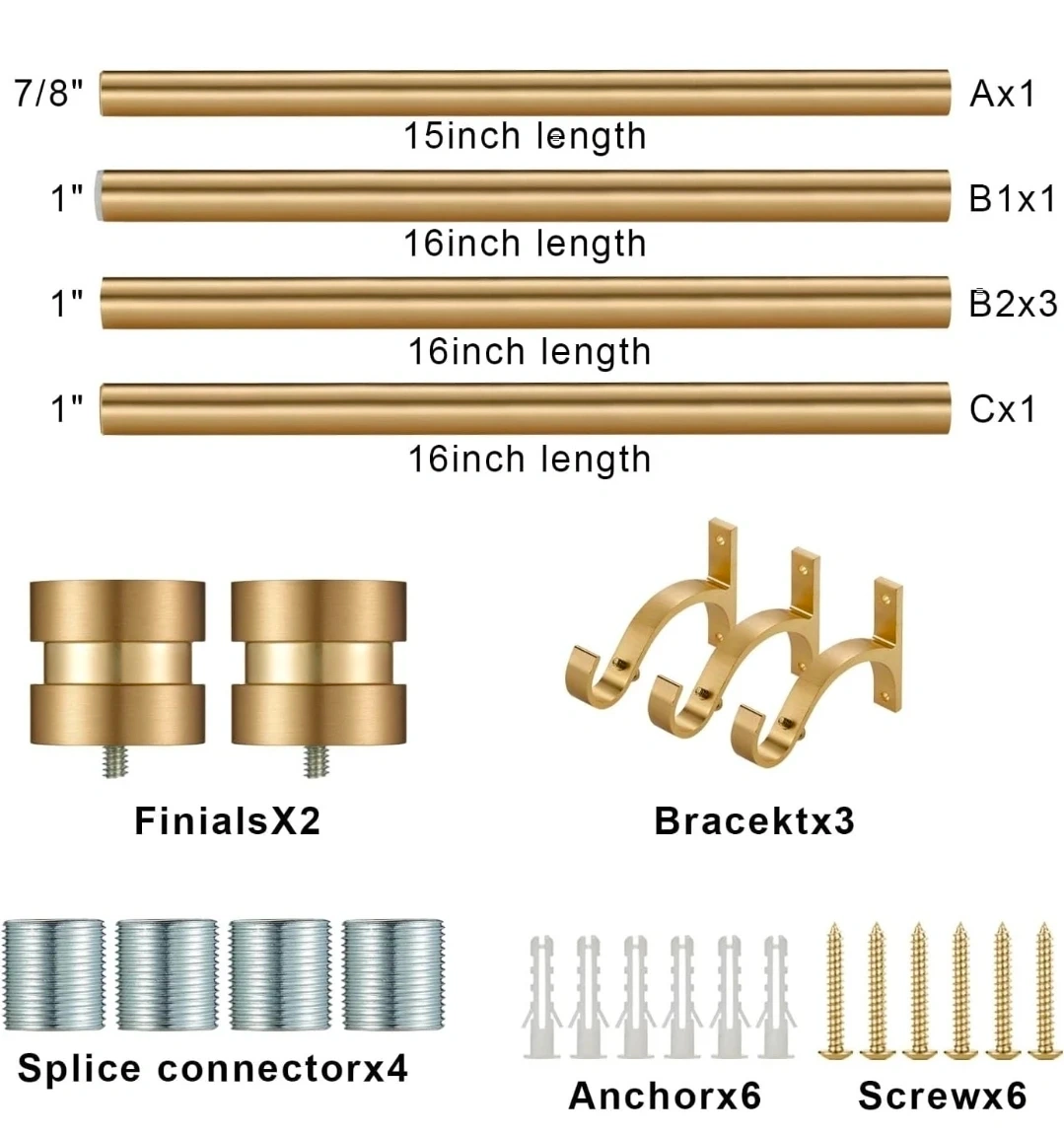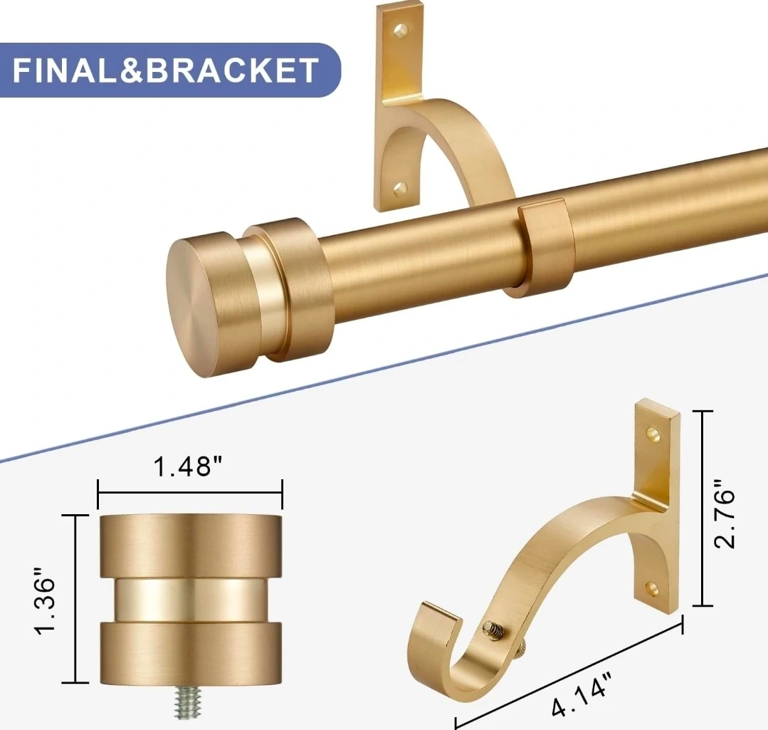 This Joodxoe curtain rod is adjustable from 16 to 86 inches. It's a heavy duty rod with aluminum splicing and finials. It's finished in a warm gold colour.