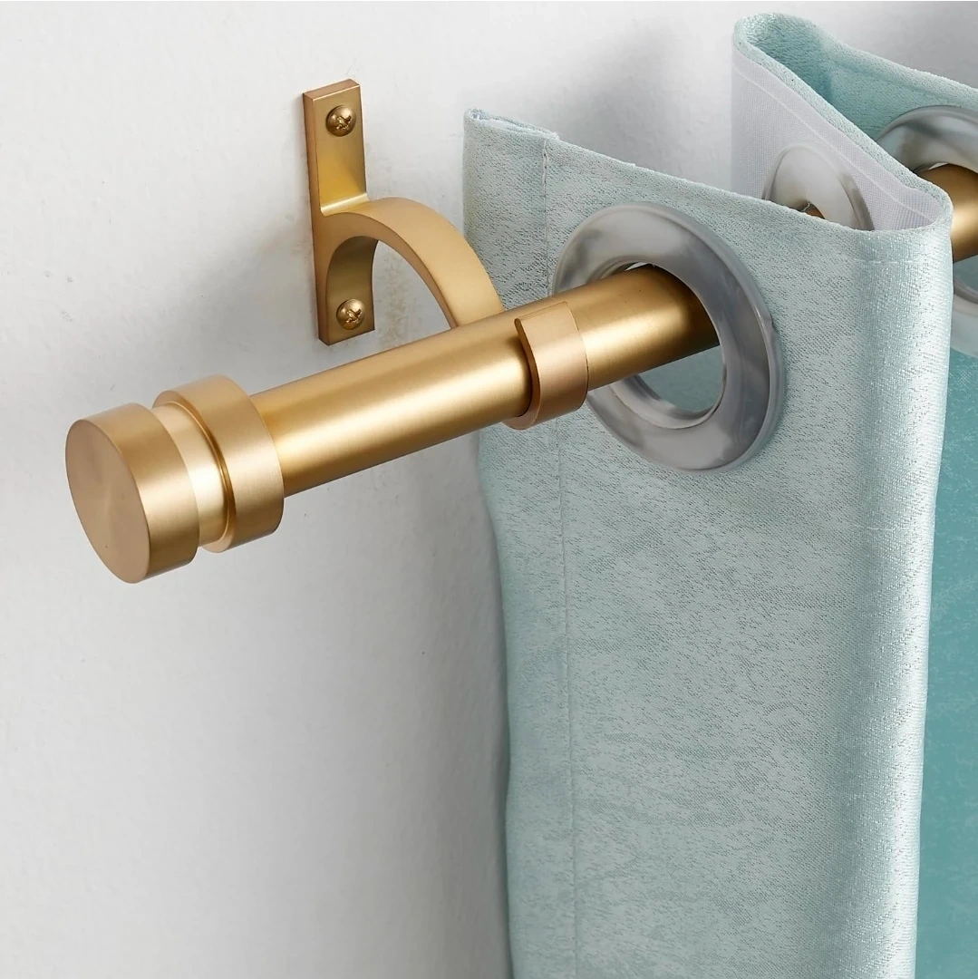 This Joodxoe curtain rod is adjustable from 16 to 86 inches. It's a heavy duty rod with aluminum splicing and finials. It's finished in a warm gold colour.