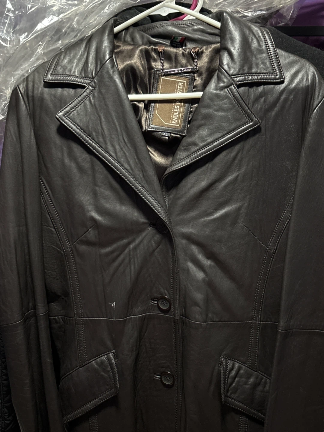 KNOLES PORTER genuine leather blazer jacket. Features a satin lining and button closure. Size XL.