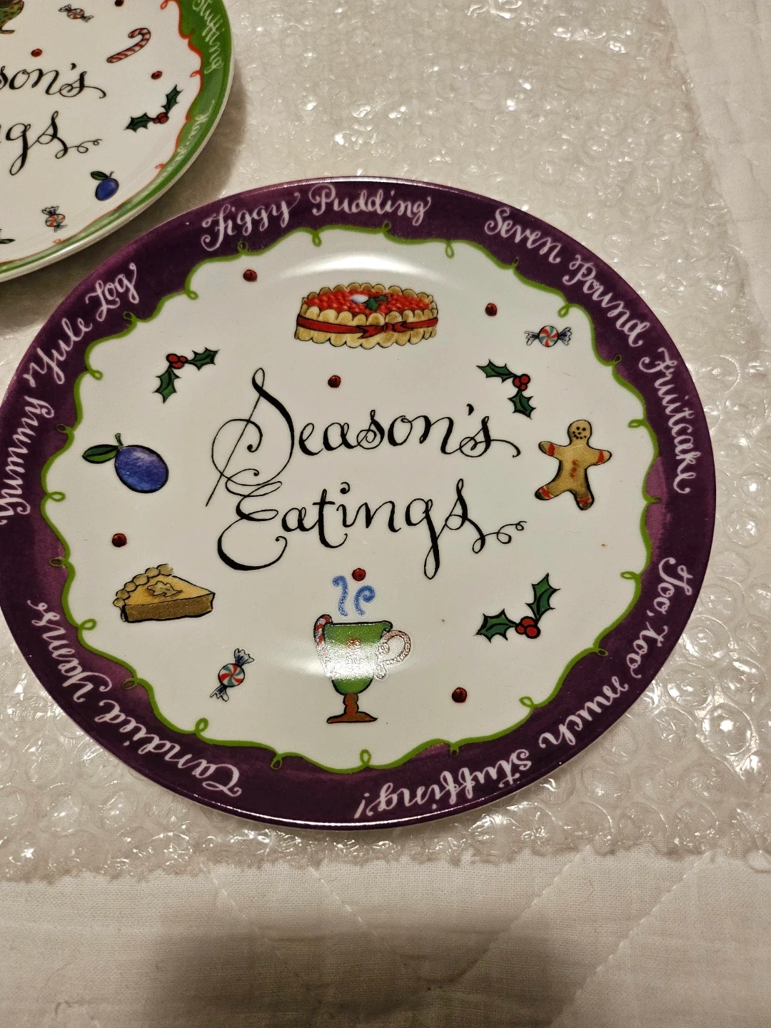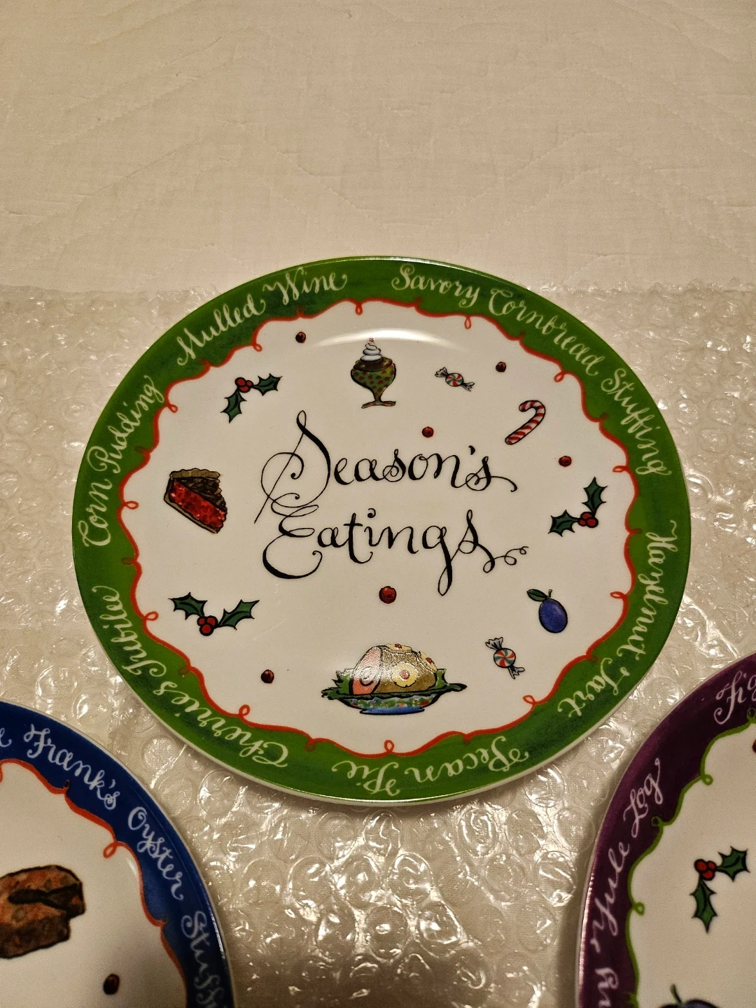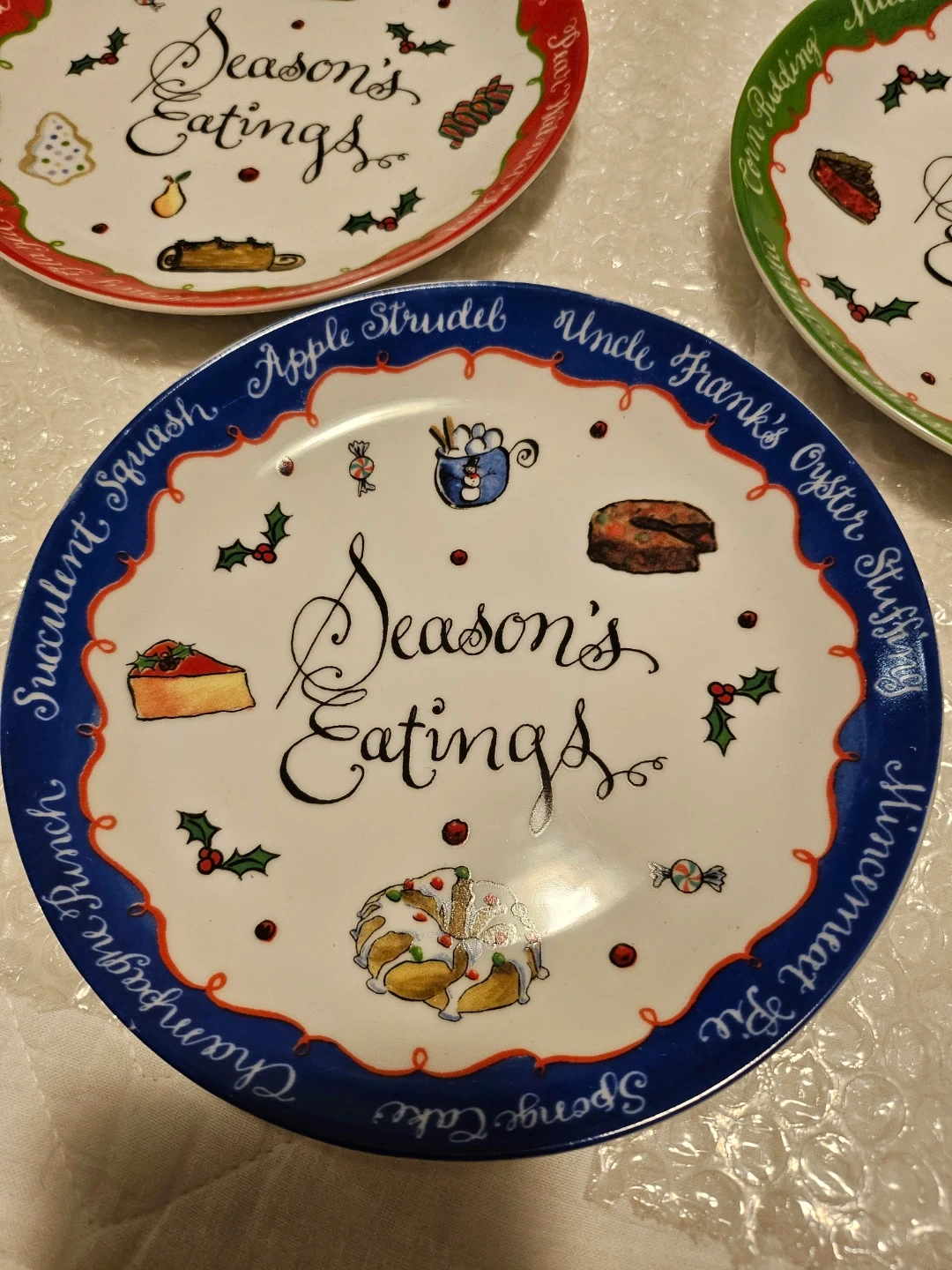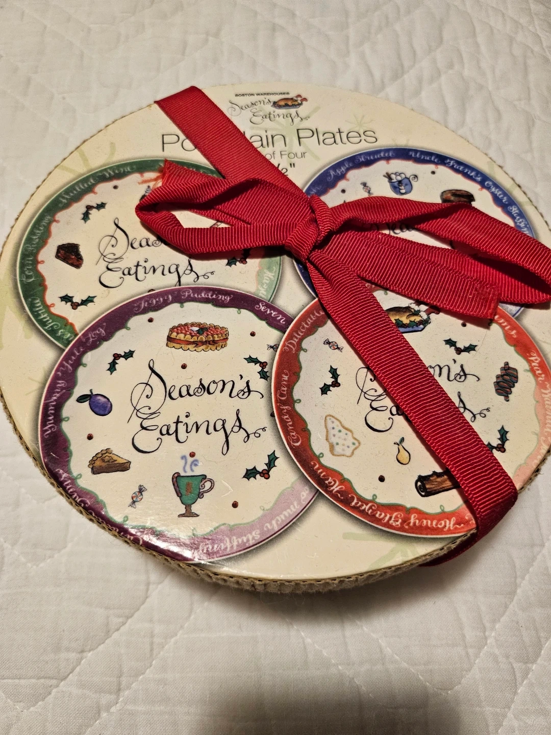 I have a set of four "Seasons Eatings" plates to give away. Each plate features festive holiday food illustrations and lettering around the rims. They come in their original box, tied with a red ribbon. Perfect for adding a touch of holiday cheer to your table or to give as a gift!