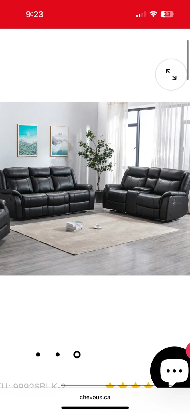This is a black leather reclining sofa. It has 2 piece three seats and features a centre console with cupholders. It's perfect for a family room!