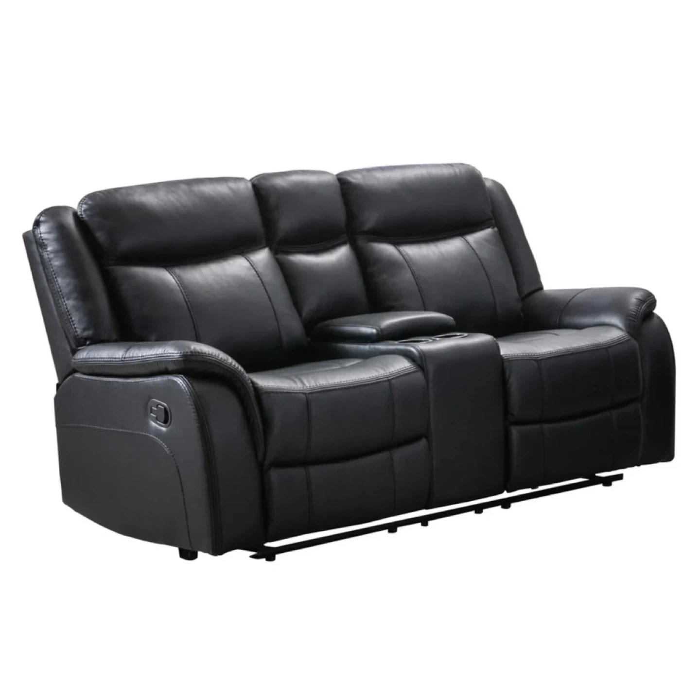 This is a black leather reclining sofa. It has 2 piece three seats and features a centre console with cupholders. It's perfect for a family room!