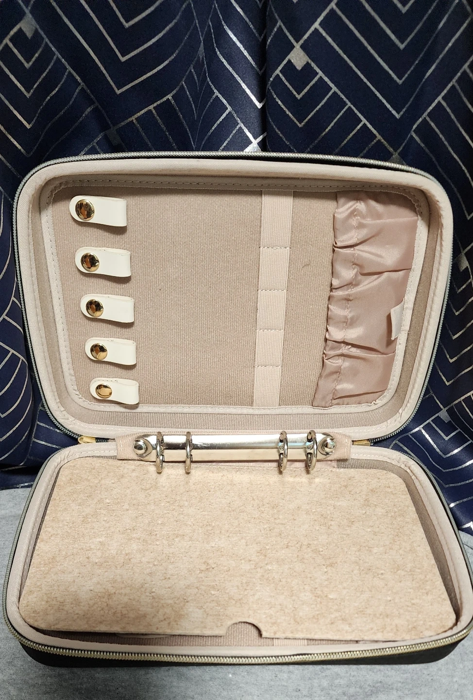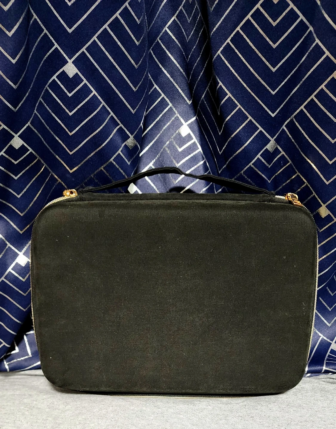 This ProCase jewelry organizer is black with gold zippers. It's ideal for travel. Interior features ring rolls, earring slots, and zippered pockets for storage.