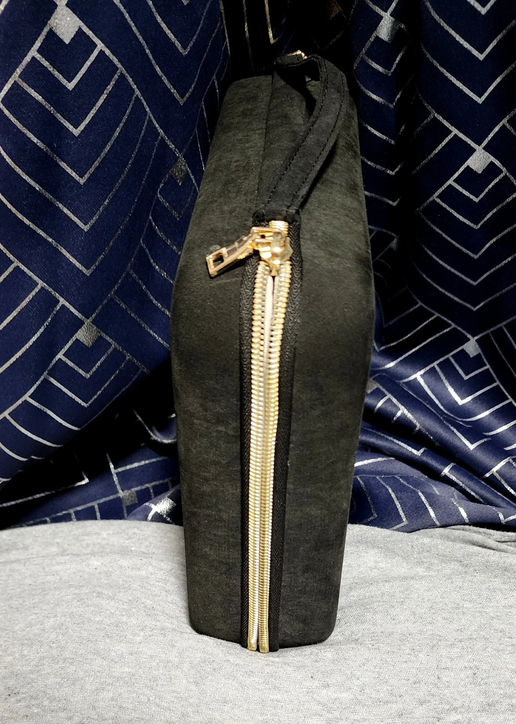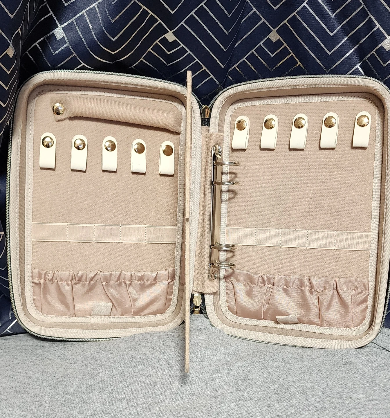 This ProCase jewelry organizer is black with gold zippers. It's ideal for travel. Interior features ring rolls, earring slots, and zippered pockets for storage.