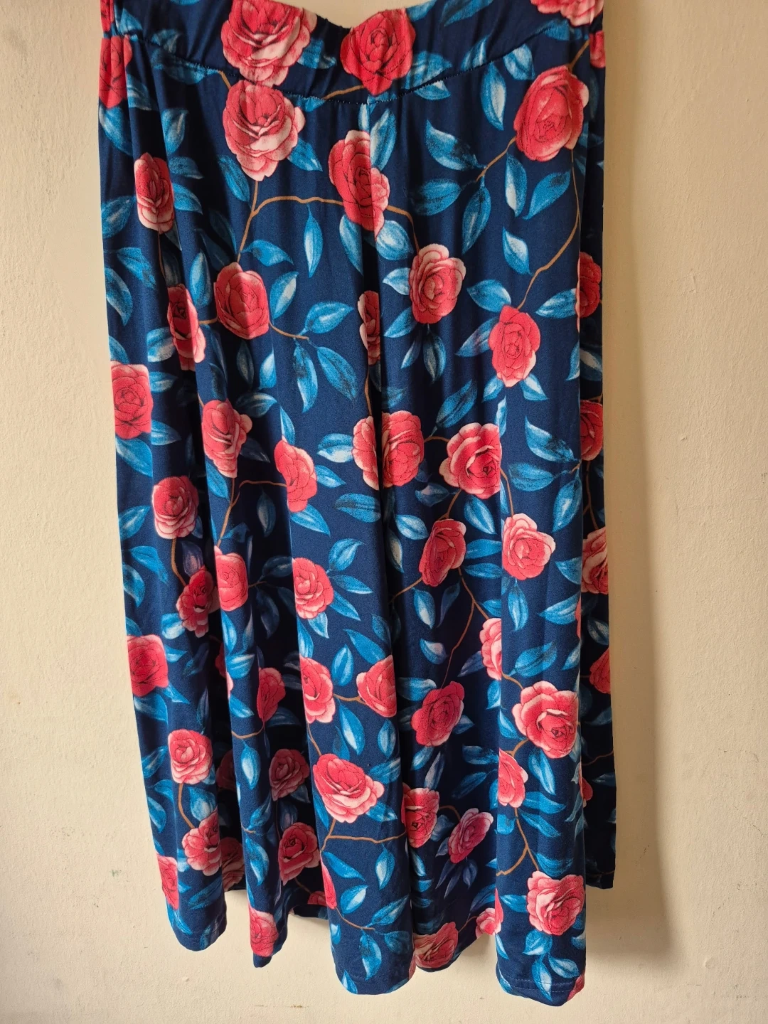 Blue pants featuring a vibrant red and pink floral print with green leaves. These pants have a wide leg silhouette. The fabric appears to be a soft, flowy material. They're perfect for a casual day out or lounging at home!