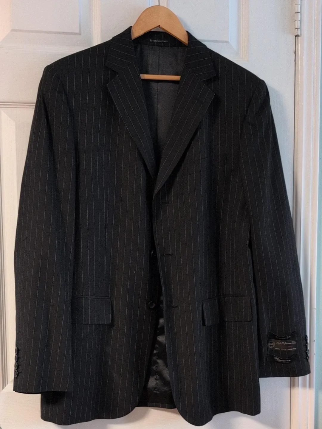 A classic black suit jacket by Evan Picone featuring subtle pinstripes. It's styled in Italy and made for a sharp look. This blazer has a smooth lining and two front pockets.