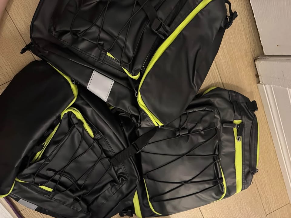 Water-resistant, Large storage capacity, Reflective strips for safer night riding, Multiple compartments for organized storage, Secure rack mounting system and Sleek black design with high-visibility accents