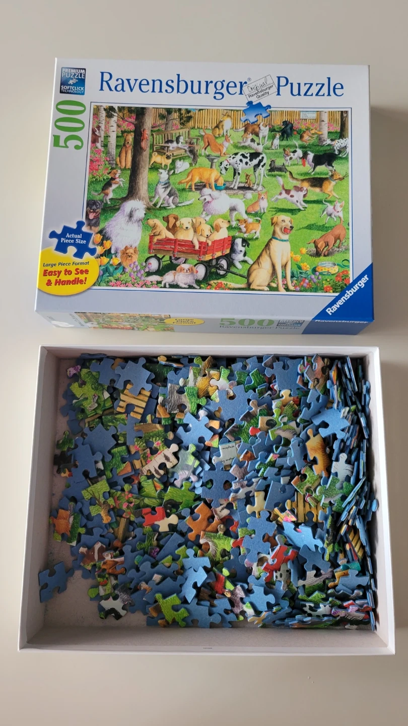 Selling a Ravensburger 500-piece puzzle featuring a cute dog theme! The puzzle is in great condition and ready for a new home. It has large pieces that are easy to see and handle