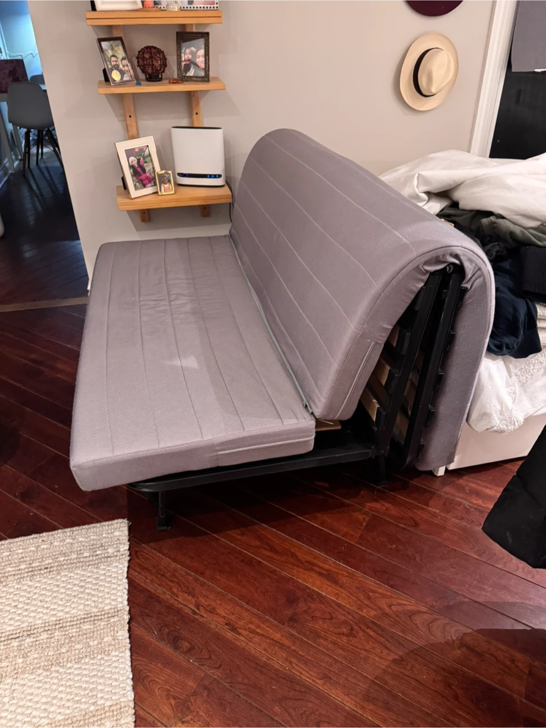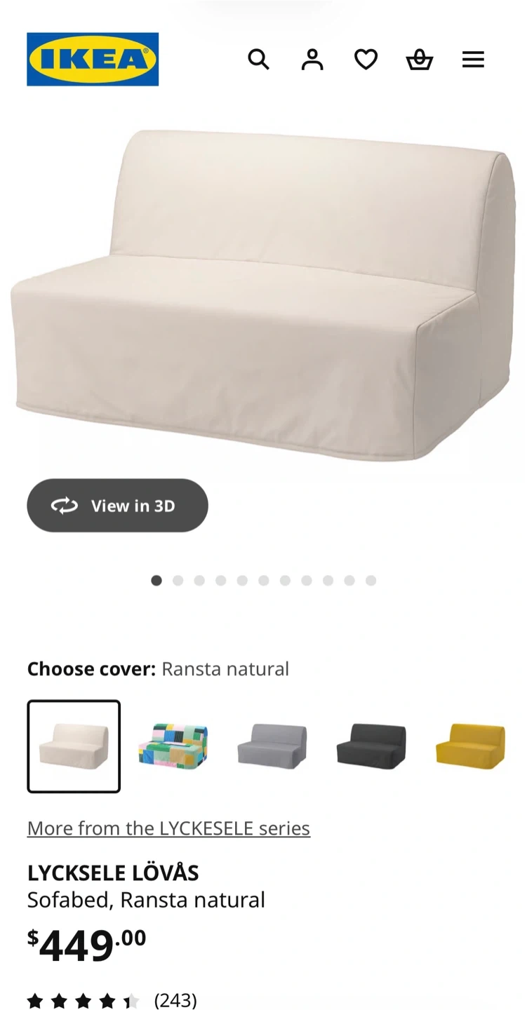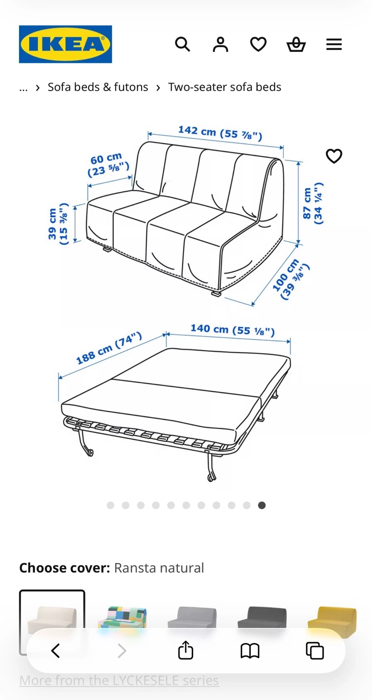 IKEA LYCKSELE LÖVÅS sofabed with a Ransta natural cover. It measures 142 cm wide and 100 cm deep when unfolded as a bed. This piece easily converts from a sofa to a bed, making it handy for guests!
