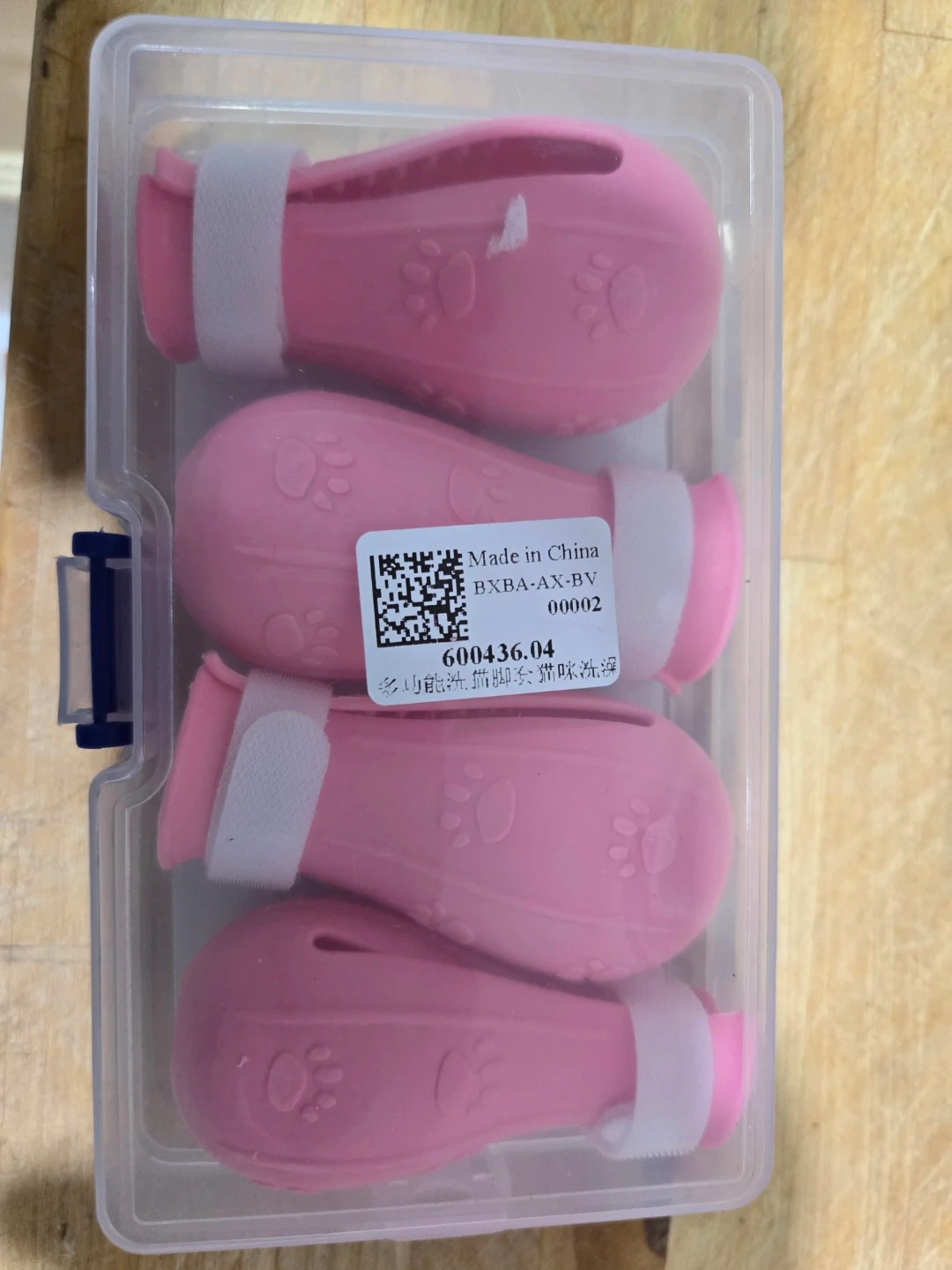 These are four pink paw covers designed for washing pets. They're made of a soft, flexible material with Velcro straps for a secure fit. The covers help protect paws during baths. Great for keeping paws clean after outdoor adventures!