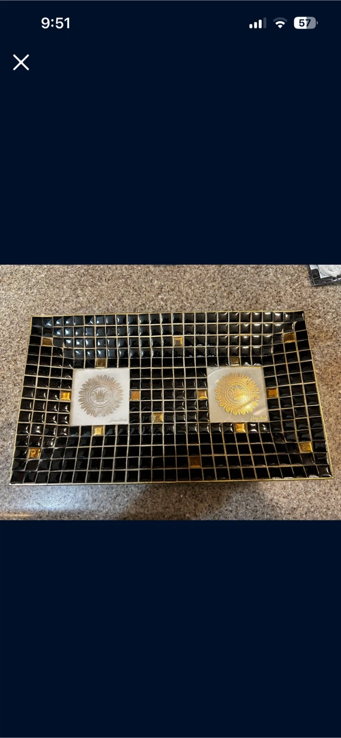 This decorative tray features a black mosaic tile design with gold accents. It has two inset squares with intricate gold designs. This piece adds a touch of elegance to any surface!