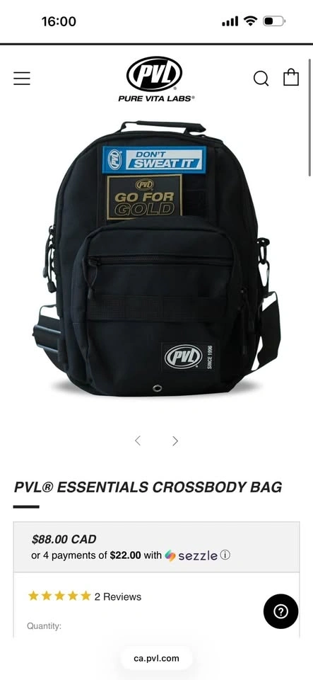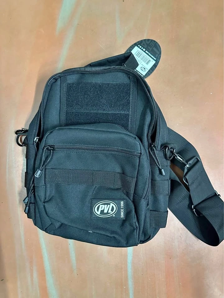 New black PVL crossbody bag with original tags attached. This tactical-style bag has durable nylon material, multiple zippered compartments, and MOLLE webbing on the front and sides. It features a large velcro patch area on the top front and a breathable mesh back panel for comfort. Adjustable shoulder strap is included.