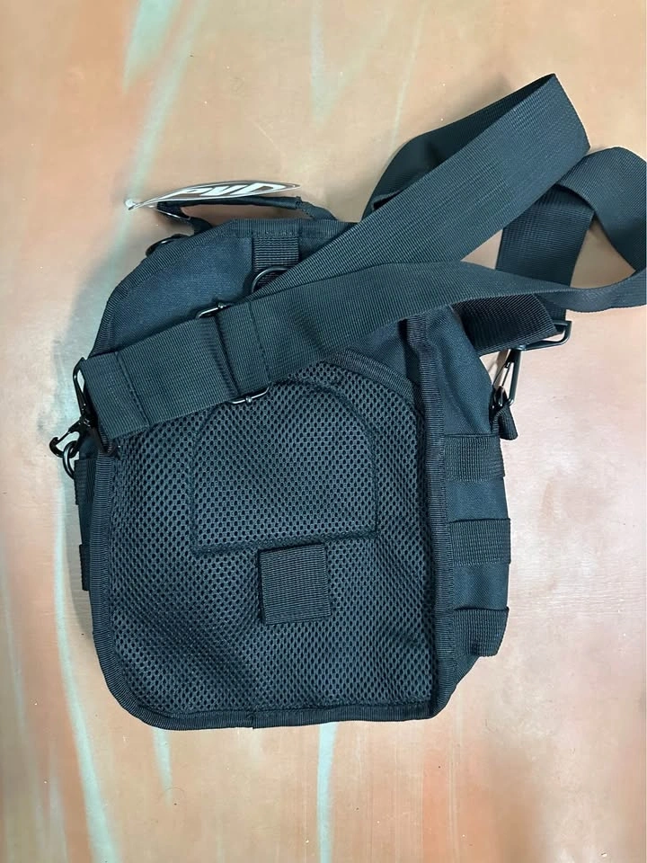 New black PVL crossbody bag with original tags attached. This tactical-style bag has durable nylon material, multiple zippered compartments, and MOLLE webbing on the front and sides. It features a large velcro patch area on the top front and a breathable mesh back panel for comfort. Adjustable shoulder strap is included.
