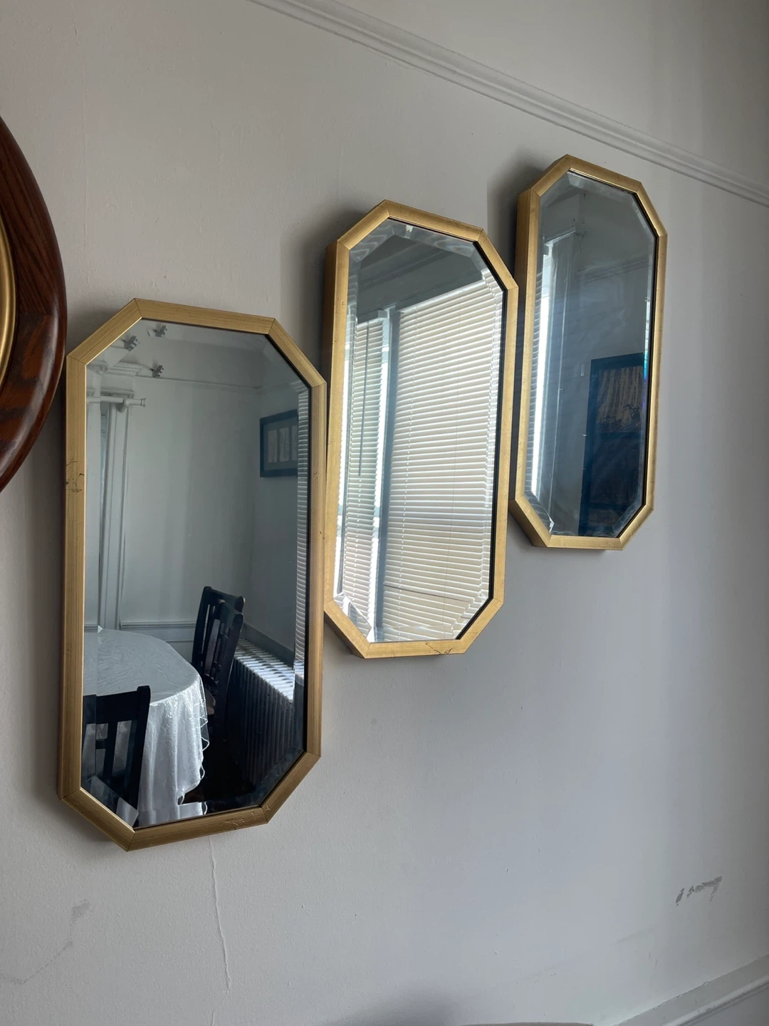 Add a touch of elegance to your home with this set of three octagon mirrors. Each mirror features a sleek gold-tone frame. They're perfect for entryways, living rooms, or bedrooms!